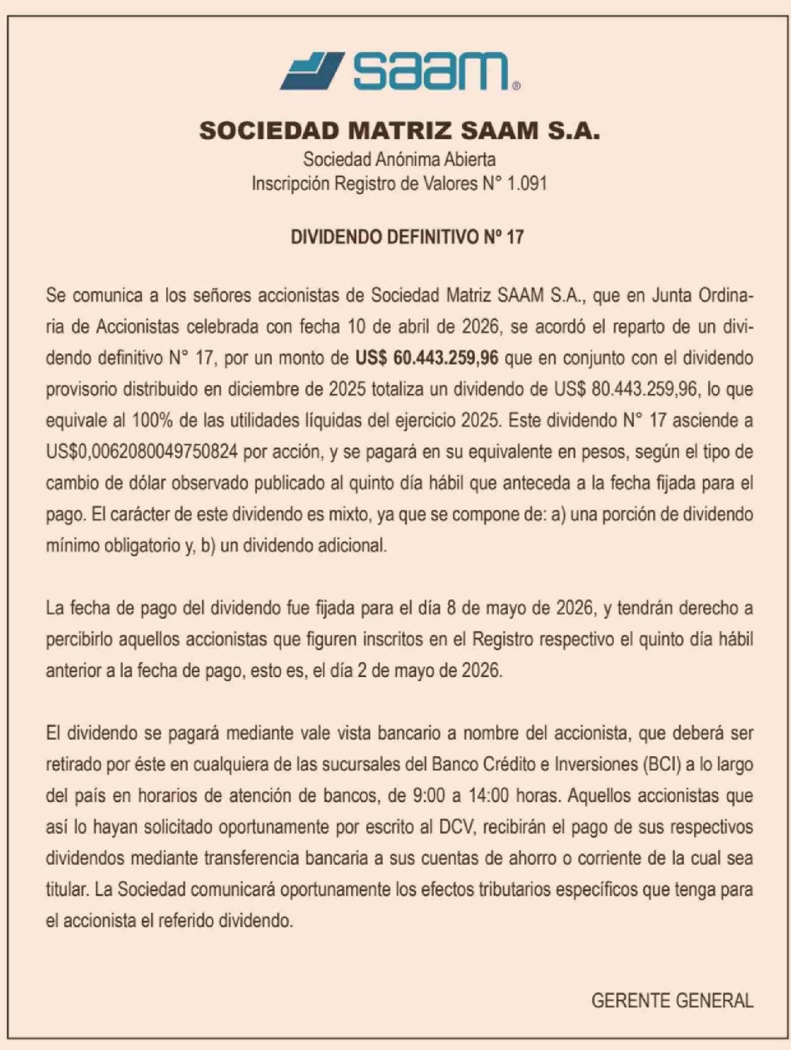 EXTRACTOS: SOCIEDAD MATRIZ SAAM S.A. 23-04-2026 Diario Financiero |