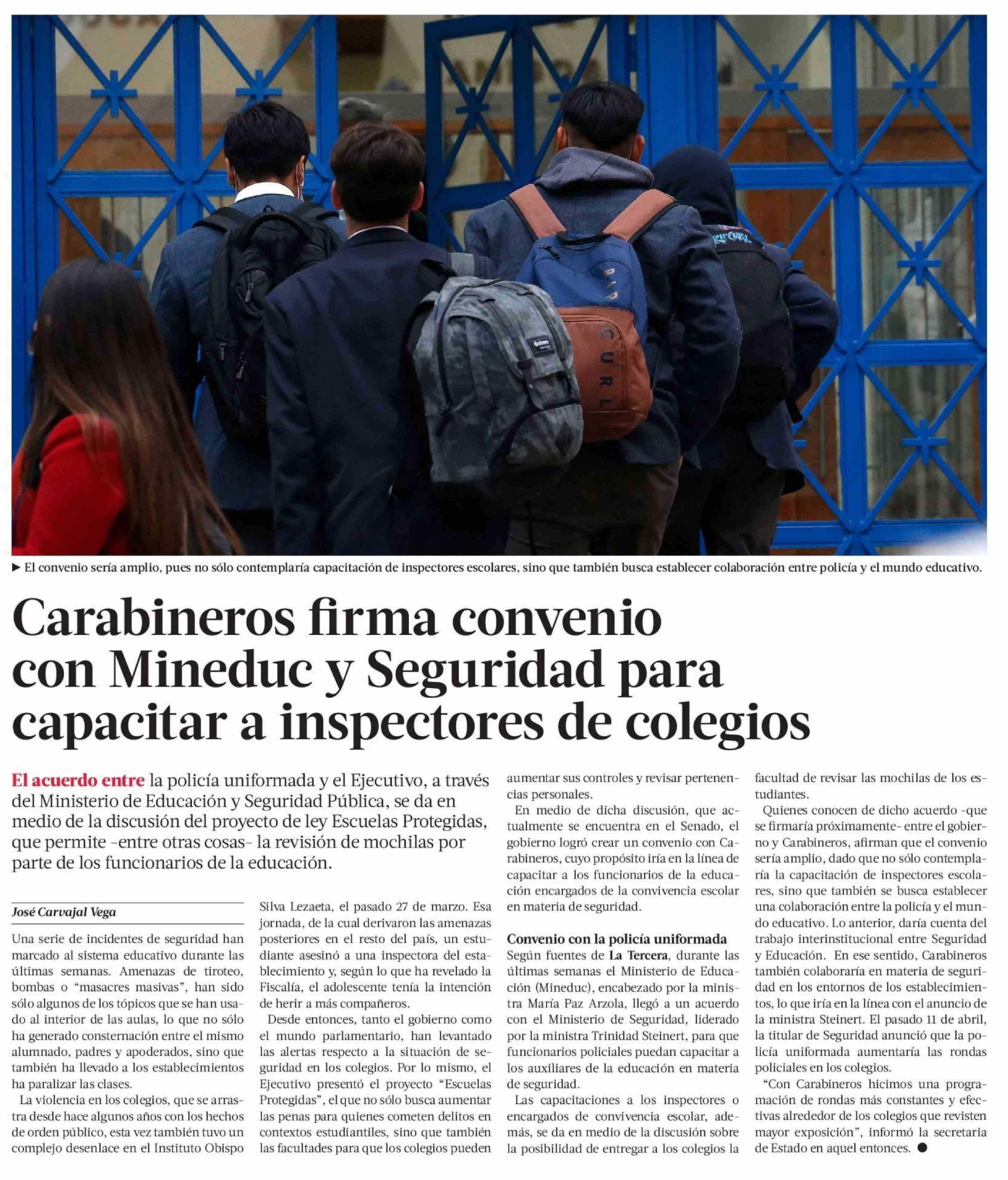 Carabineros firma convenio con Mineduc y Seguridad para capacitar a inspectores de colegios 28-04-2026 La Tercera |