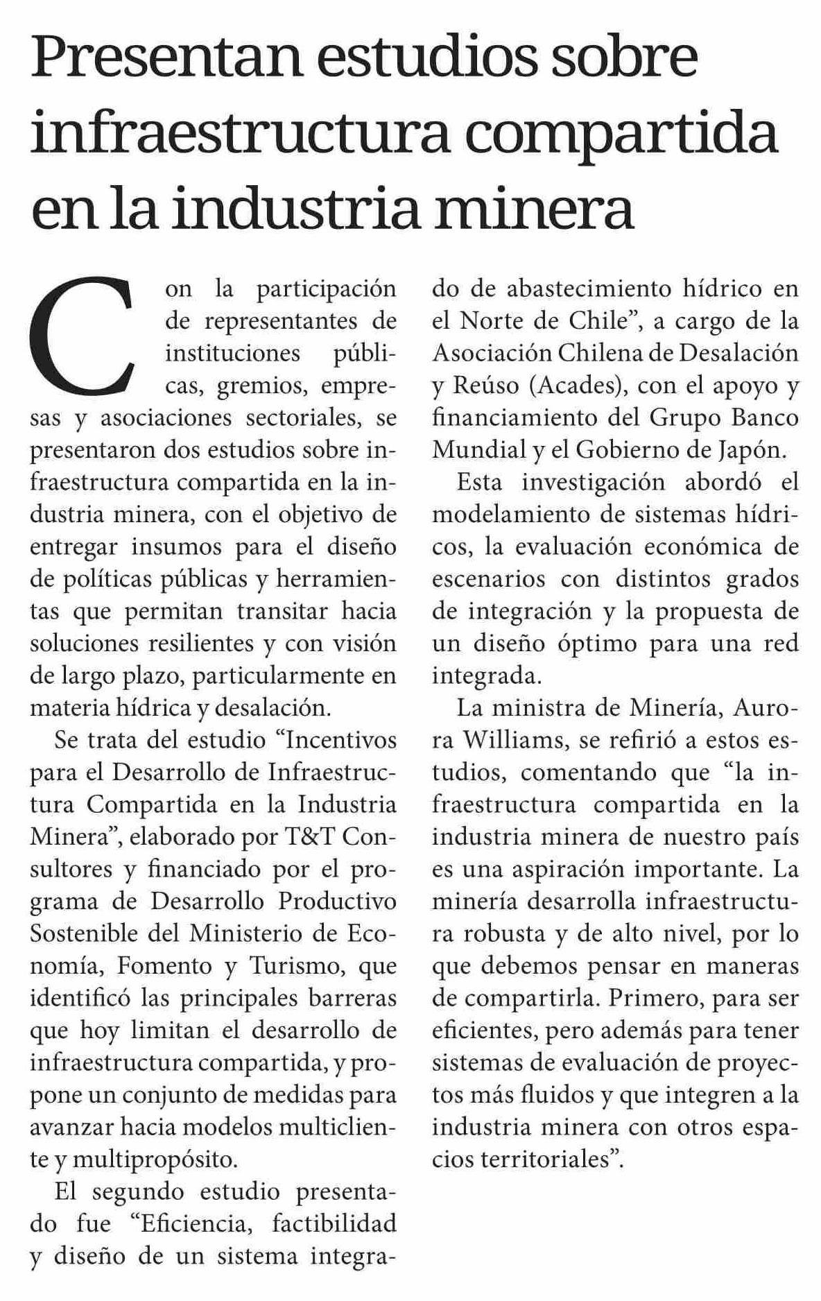 Presentan estudios sobre infraestructura compartida en la industria minera 18-01-2026 Diario Chañarcillo |