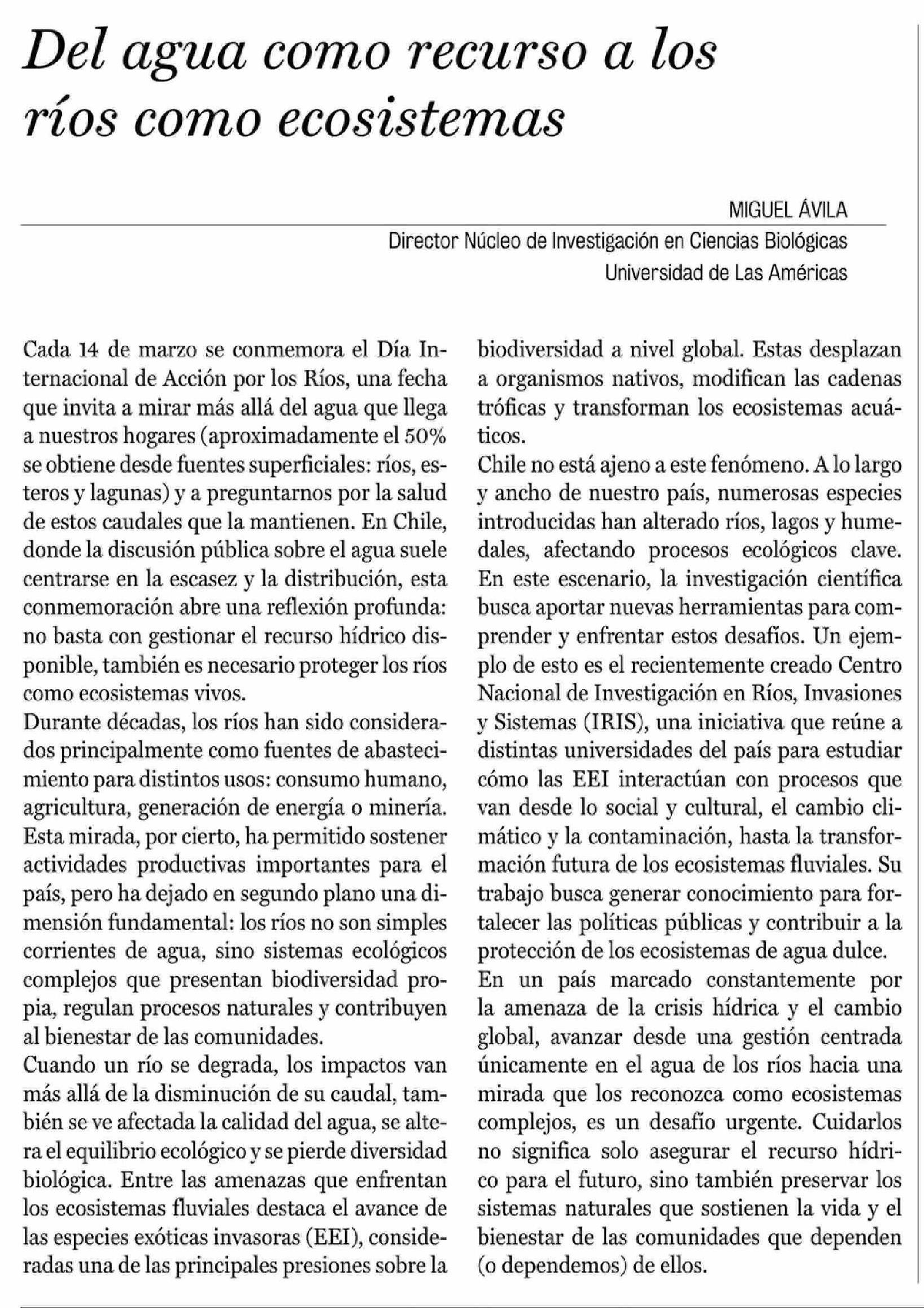 Título: Columnas de Opinión: Del agua como recurso a los ríos como ecosistemas