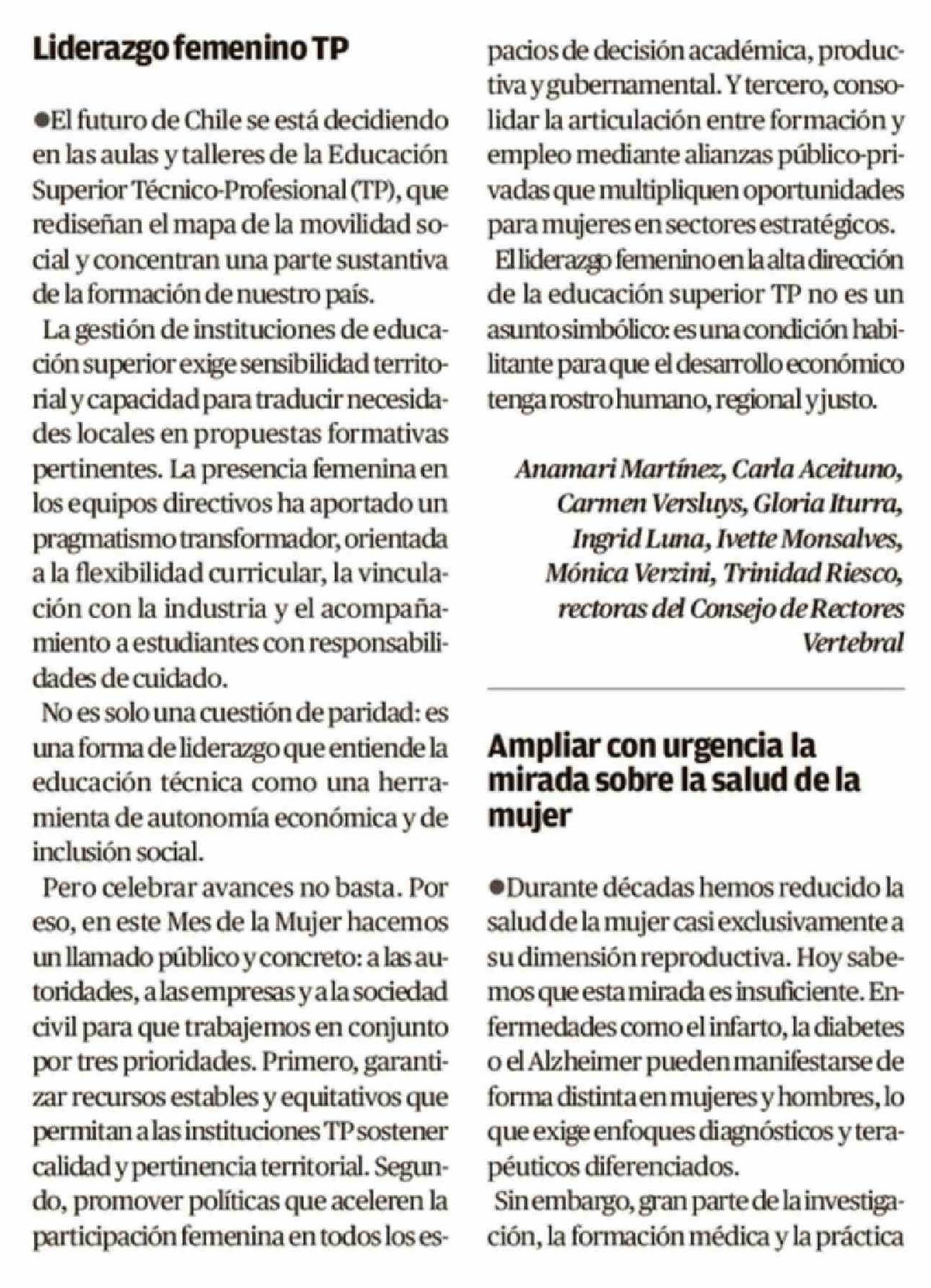 Cartas: Liderazgo femenino TP 11-03-2026 Crónica de Chillán |