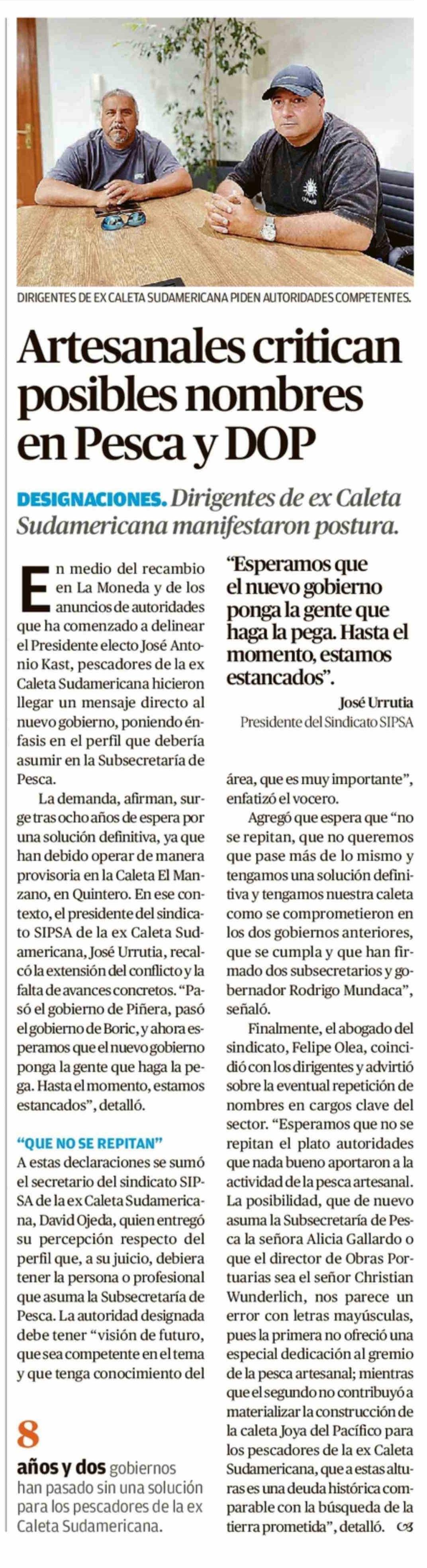 Artesanales critican posibles nombres en Pesca y DOP 07-02-2026 El Mercurio de Valparaíso |