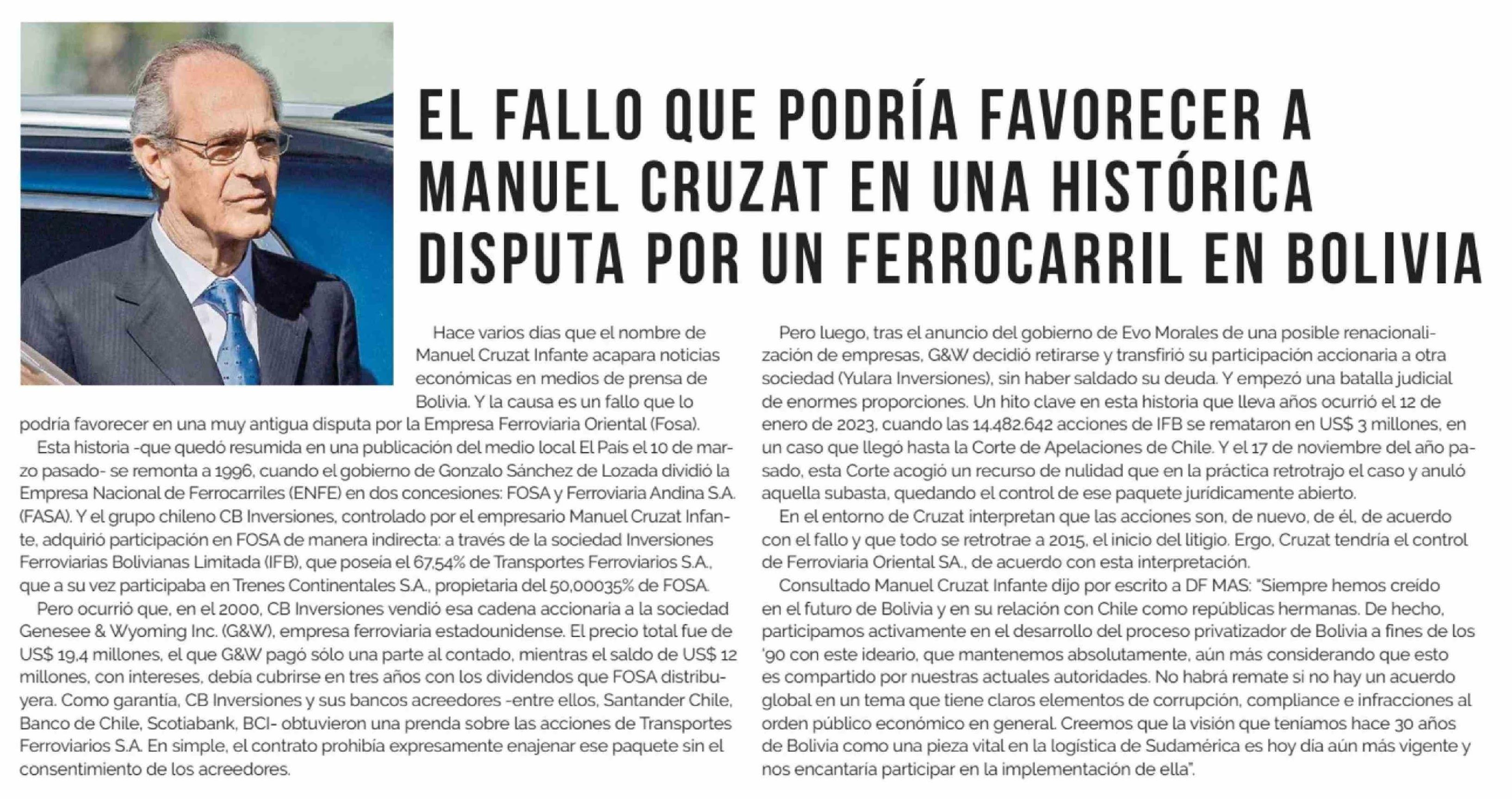 Título: EL FALLO QUE PODRÍA FAVORECER A MANUEL CRUZAT EN UNA HISTÓRICA DISPUTA POR UN FERROCARRIL EN BOLIVIA