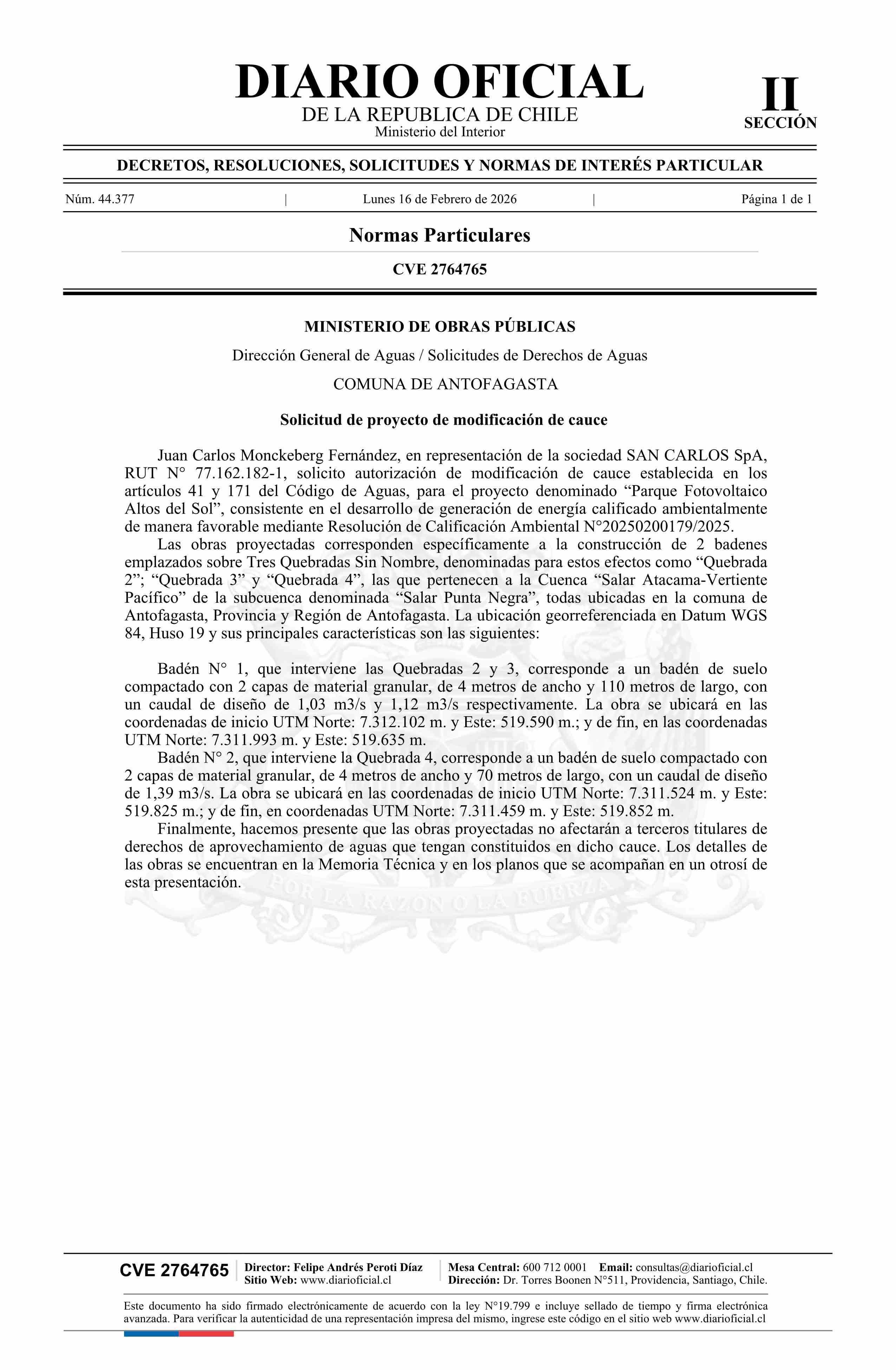 Solicitud San Carlos SpA 16-02-2026 Diario Oficial Edición Electrónica |