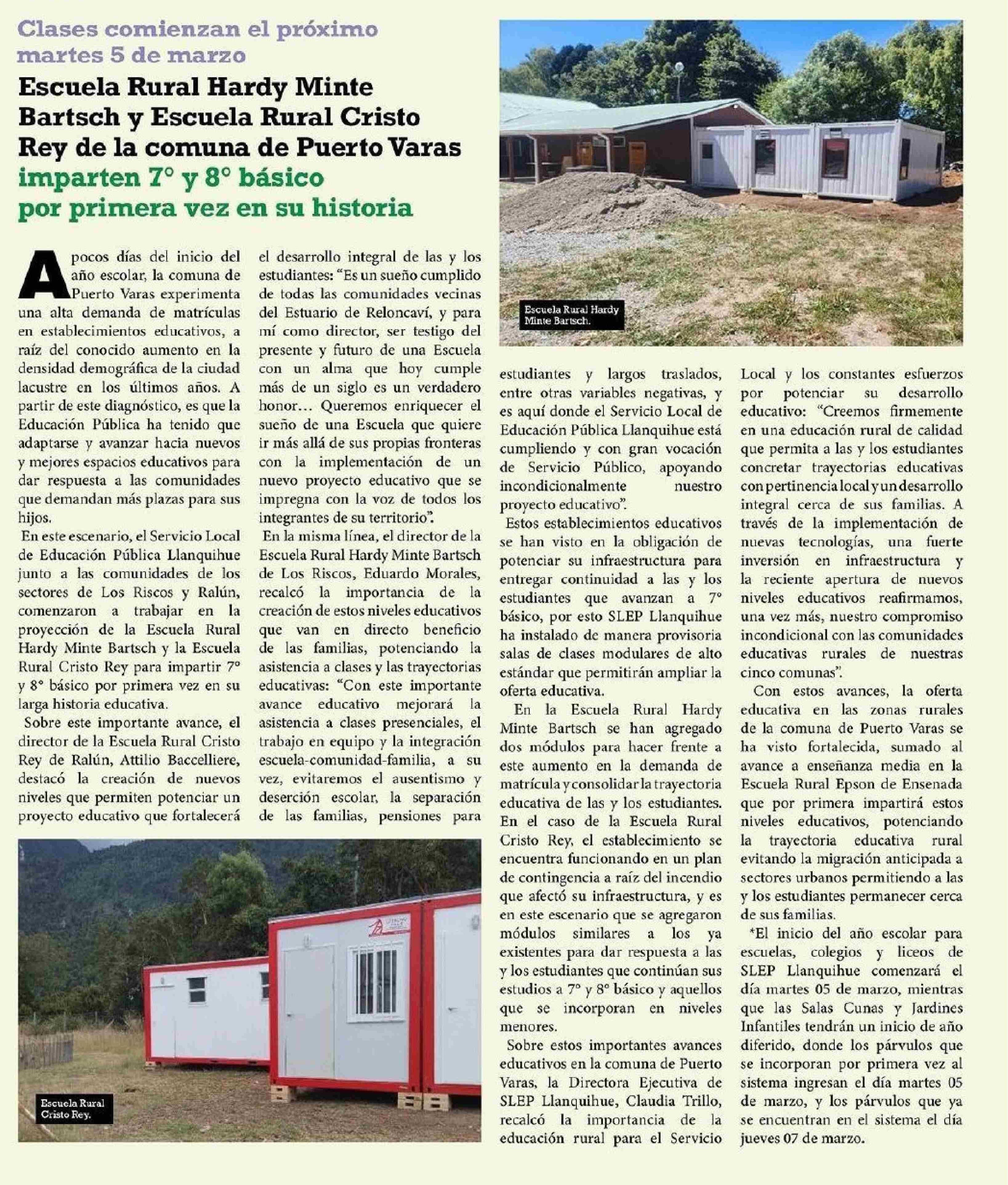 Escuela Rural Hardy Minte Bartsch y Escuela Rural Cristo Rey de la comuna de Puerto Varas imparten 7” y 8” básico por primera vez en su historia 28-02-2024 El Heraldo Austral |