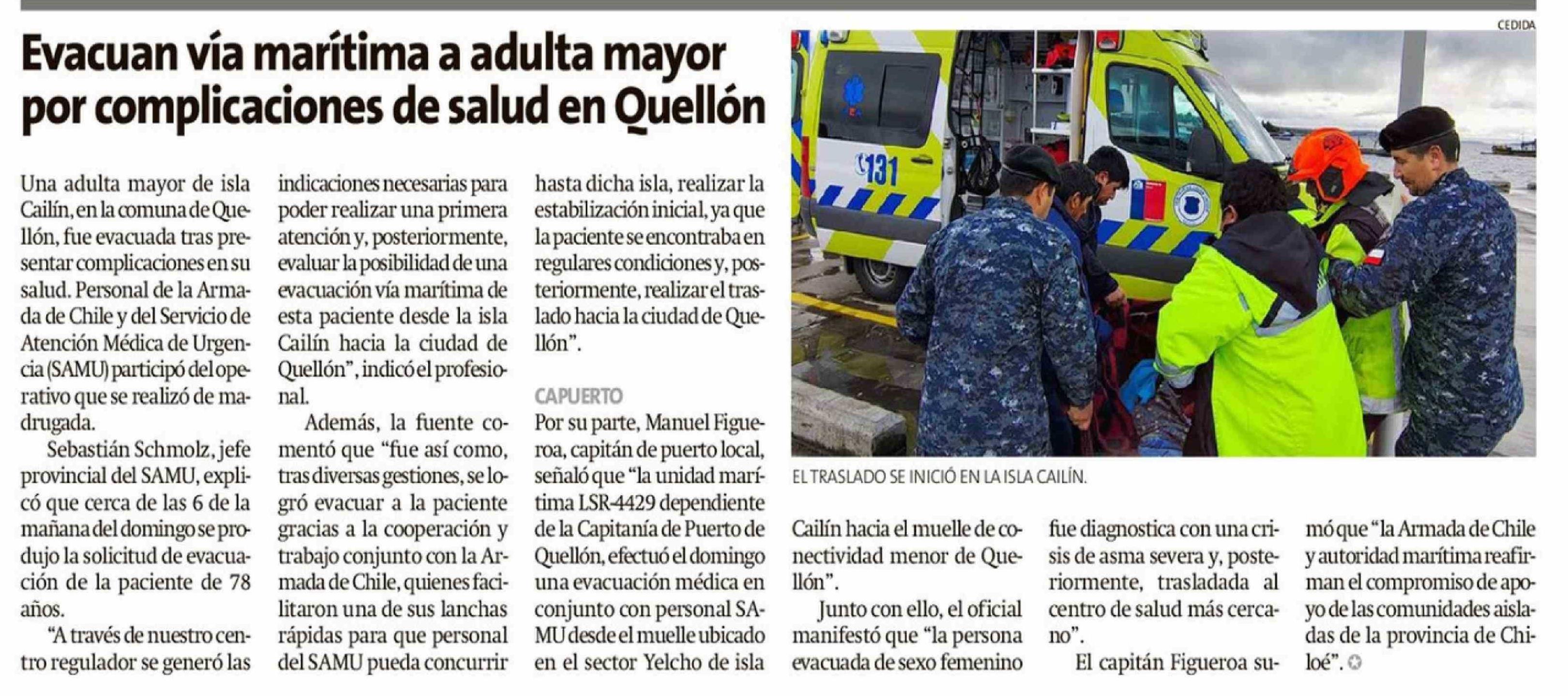 | Título: | Evacuan vía marítima a adulta mayor por complicaciones de salud en Quellón |