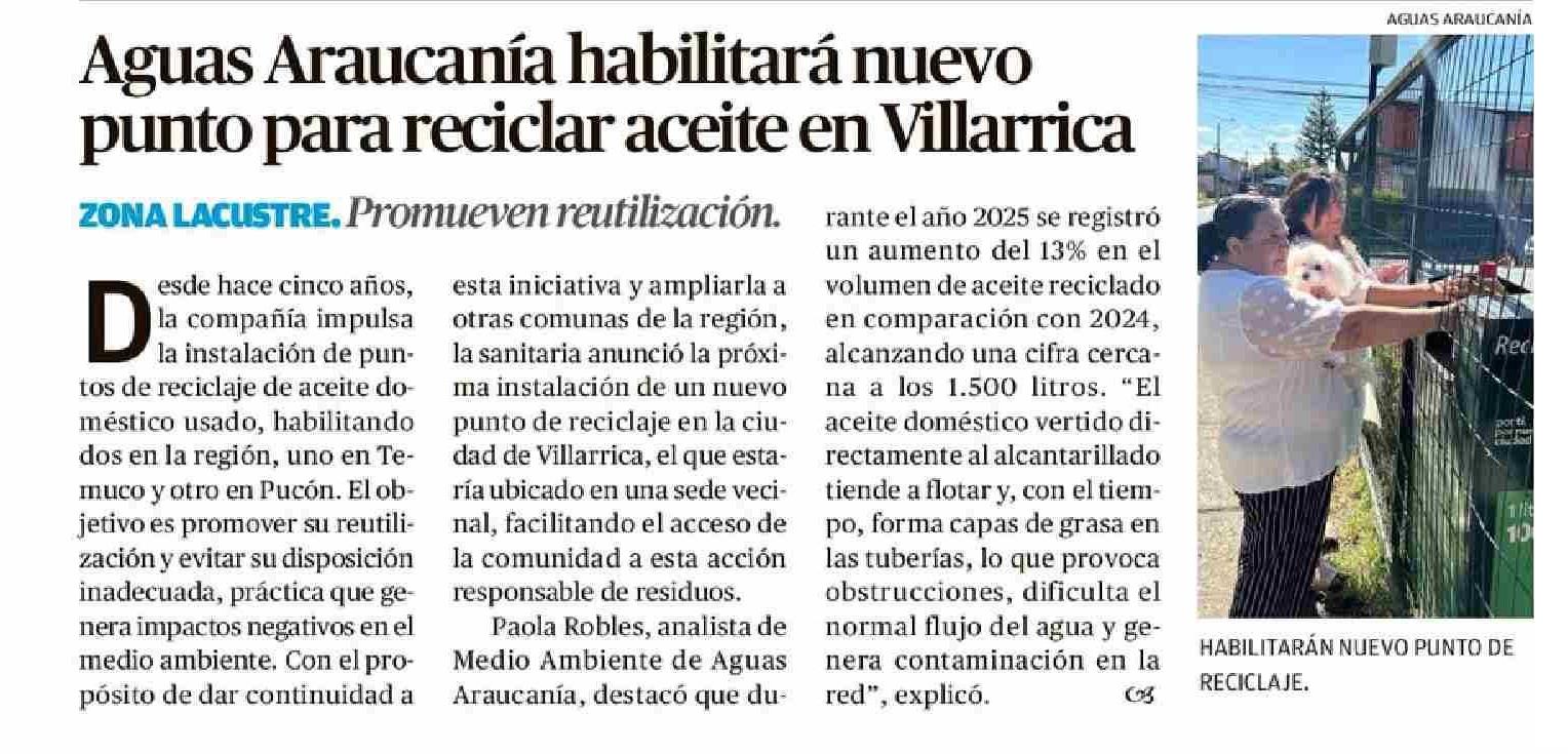 Aguas Araucanía habilitará nuevo punto para reciclar aceite en Villarrica 14-02-2026 El Austral de la Araucanía |