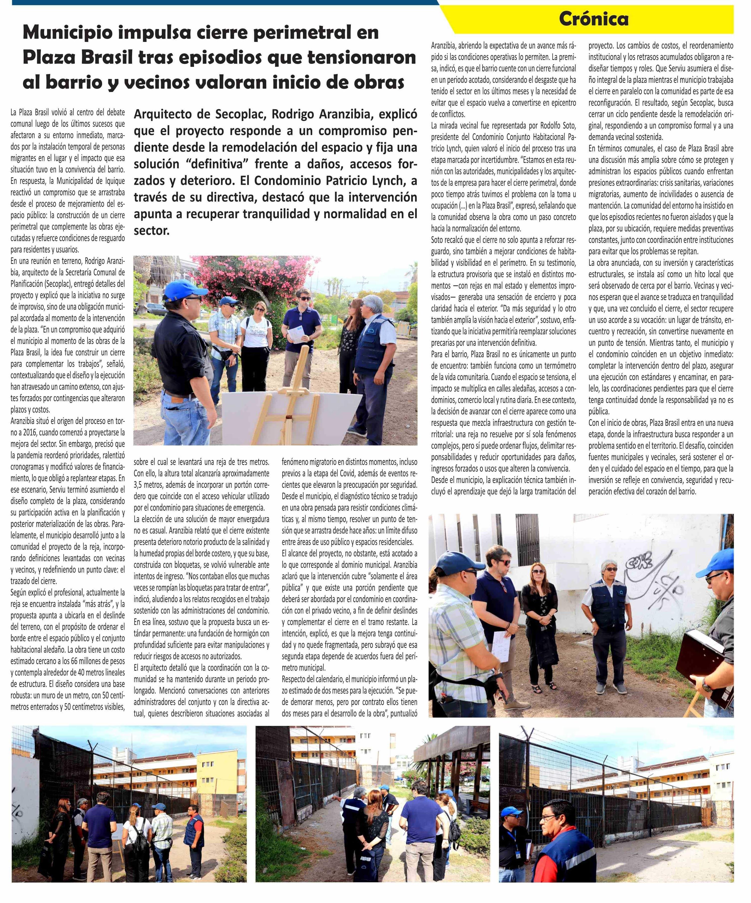 Título: Municipio impulsa cierre perimetral en Plaza Brasil tras episodios que tensionaron al barrio y vecinos valoran inicio de obras