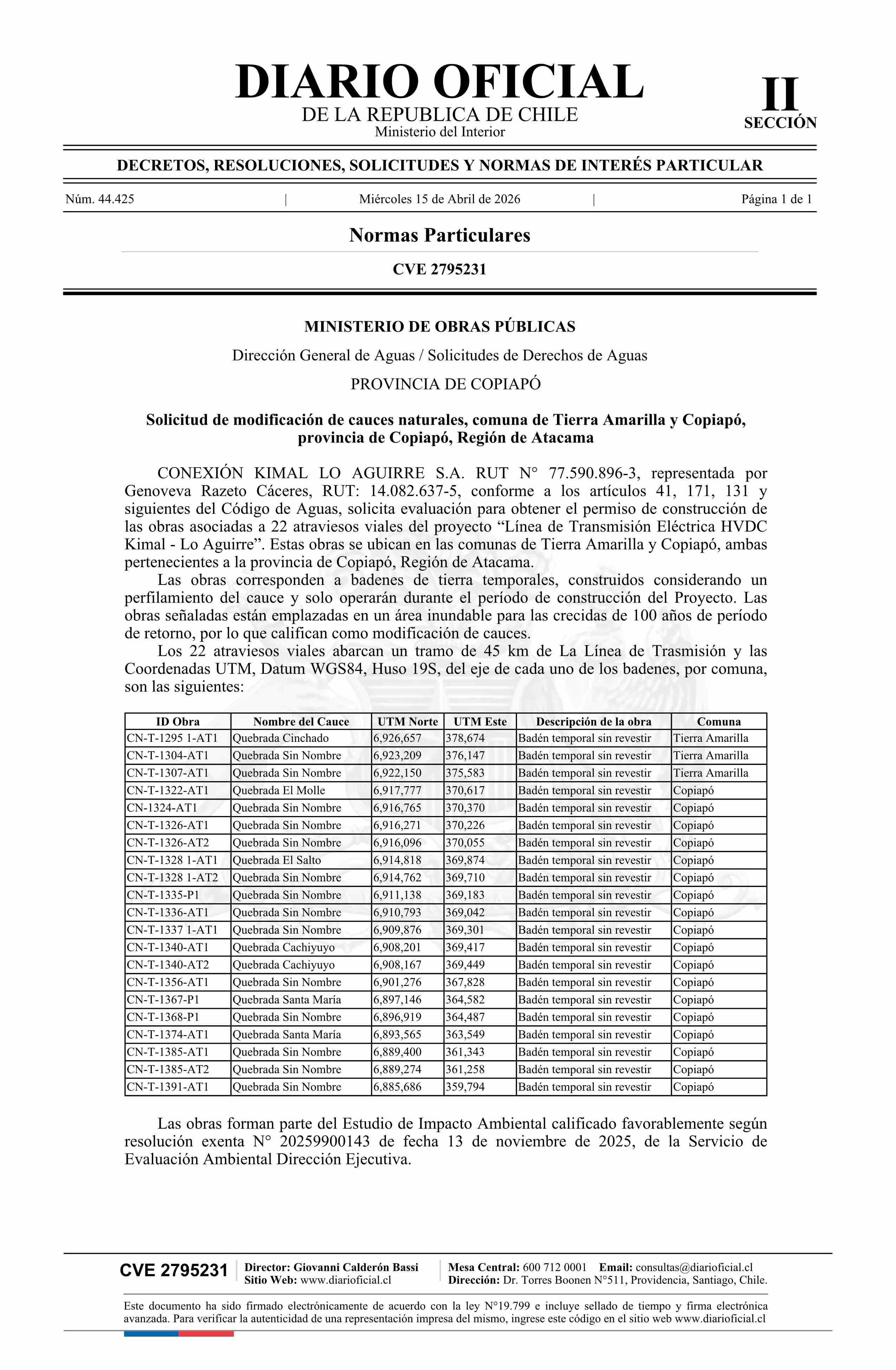 Solicitud Conexión Kimal Lo Aguirre S.A. 15-04-2026 Diario Oficial Edición Electrónica |