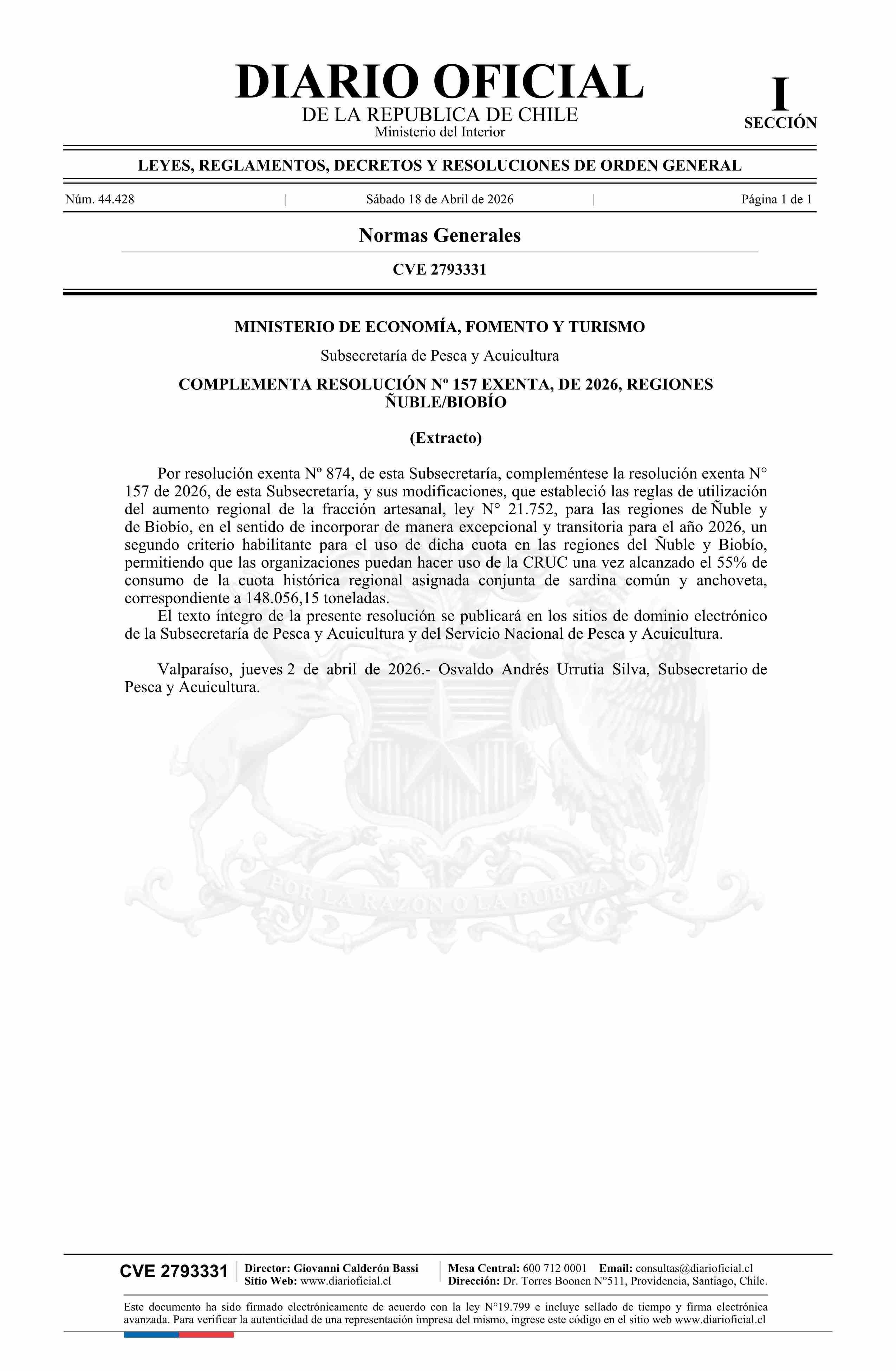 | Título: | Extracto de resolución exenta número 874, de 2026.- Complementa resolución Nº 157 exenta, de 2026, regiones Ñuble/Biobío??????? |