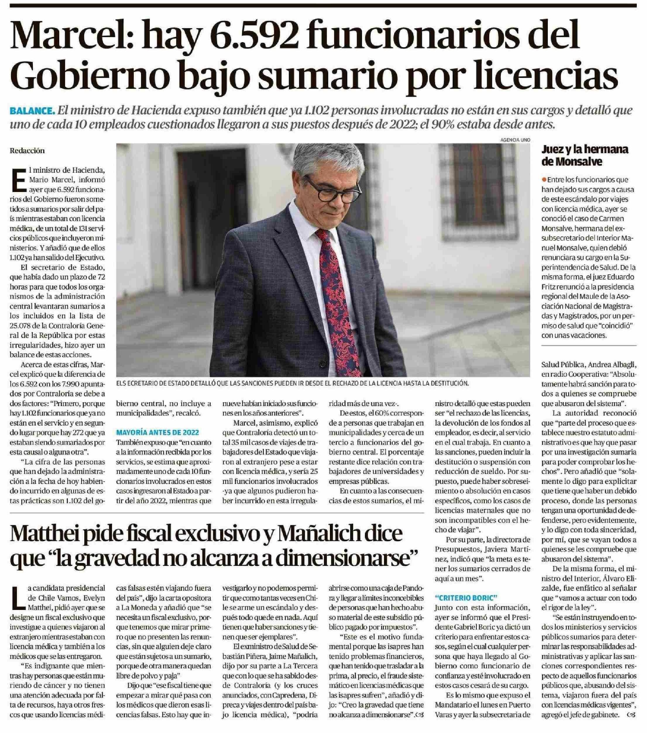 Marcel: hay 6.592 funcionarios del Gobierno bajo sumario por licencias 28-05-2025 El Austral de Osorno |