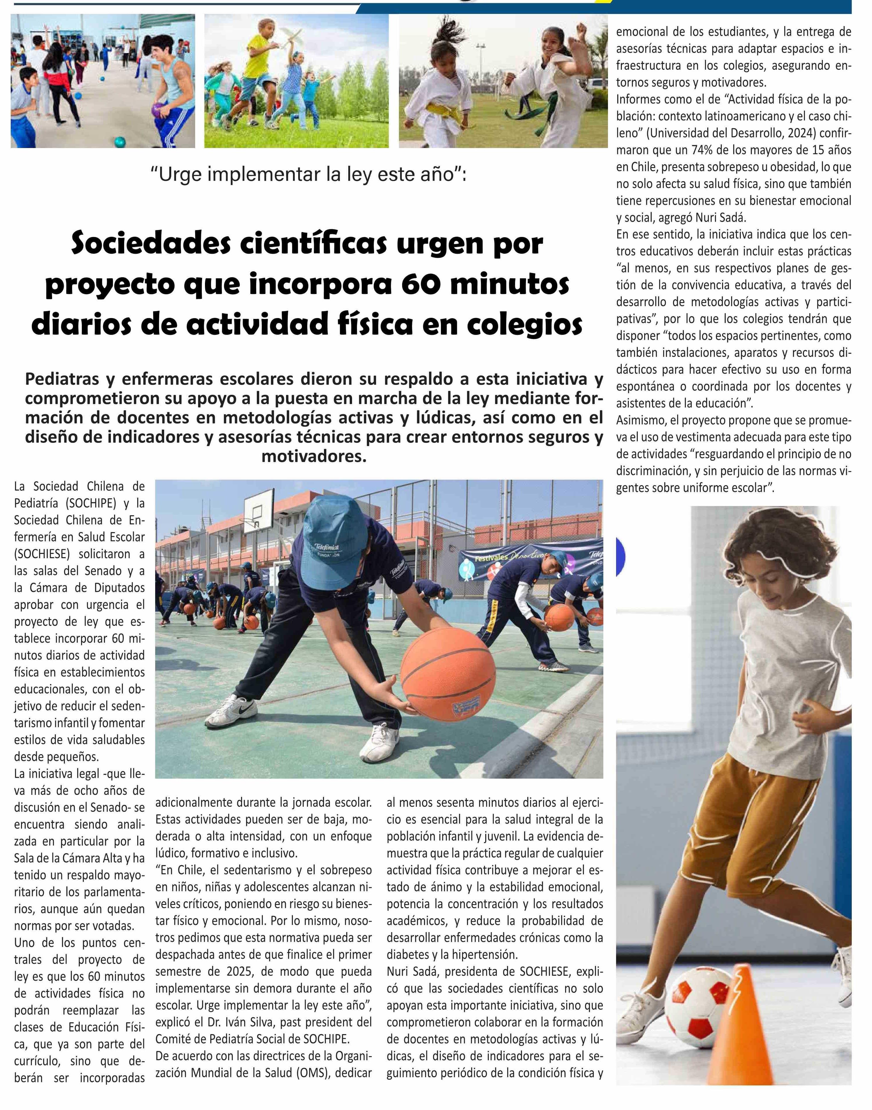| Título: | Sociedades científicas urgen por proyecto que incorpora 60 minutos diarios de actividad física en colegios |