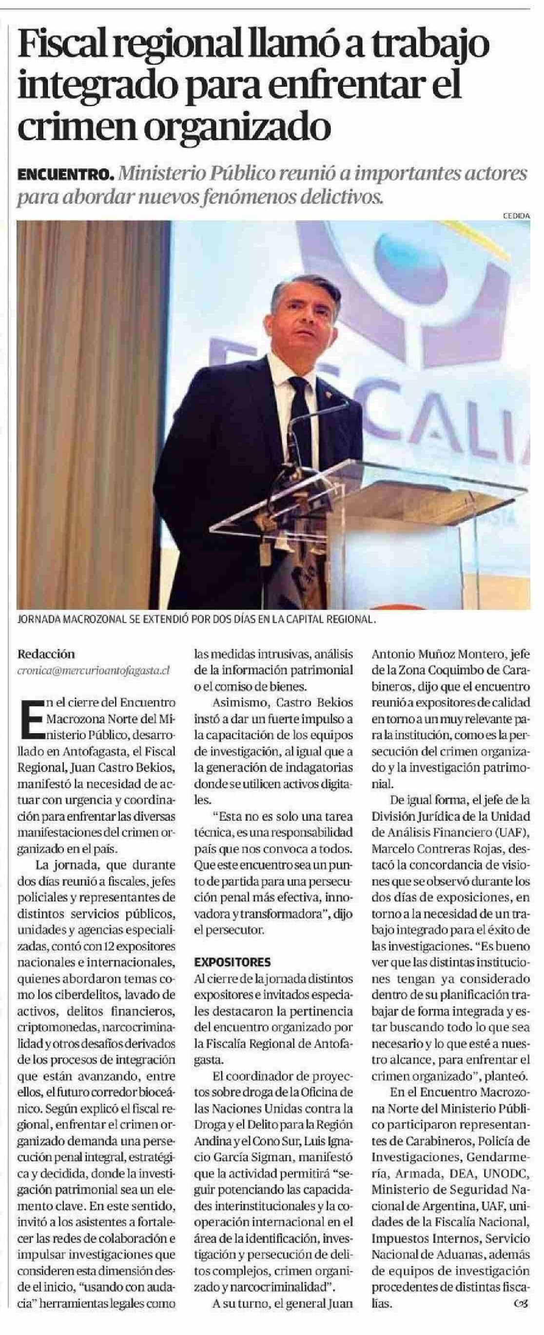 Fiscal regional llamó a trabajo integrado para enfrentar el crimen organizado 17-05-2025 El Mercurio de Calama |