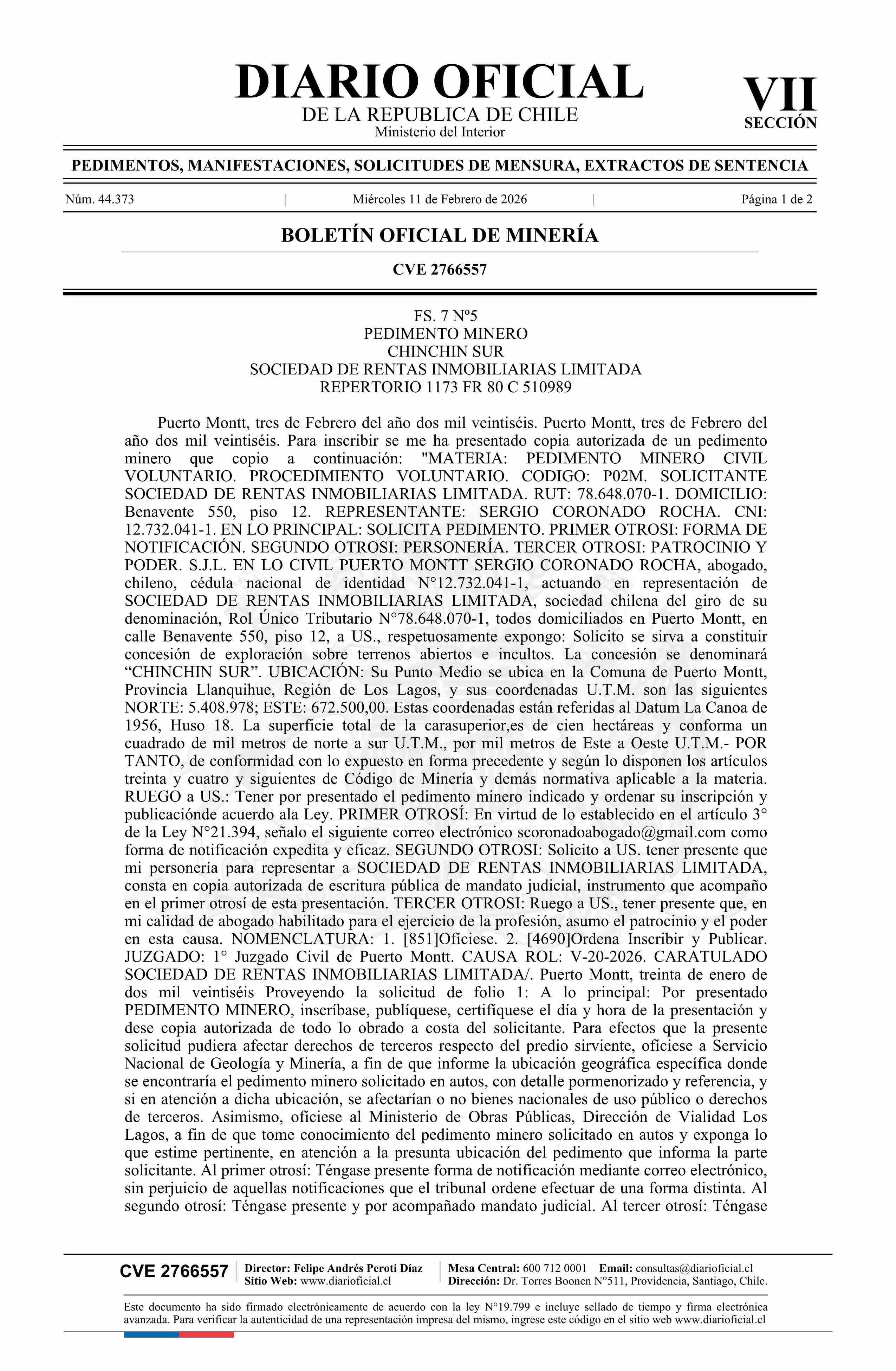CHINCHIN SUR / Sociedad de Rentas Inmobiliarias Limitada 11-02-2026 DIARIO OFICIAL CHILE - BOLETÍN OFICIAL DE MINERÍA |