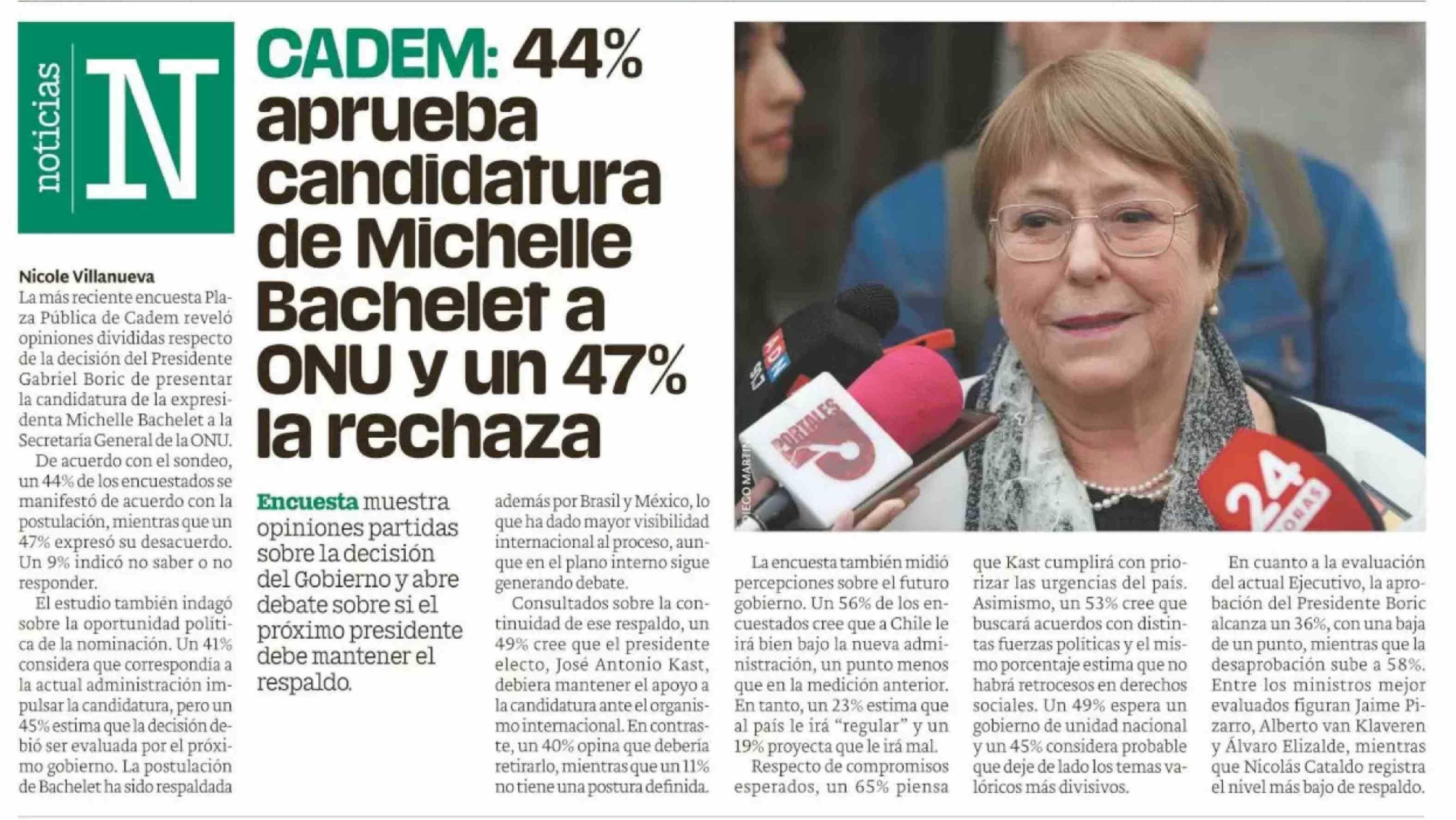 Título: CADEM: 44% aprueba candidatura de Michelle Bachelet a ONU y un 47% la rechaza