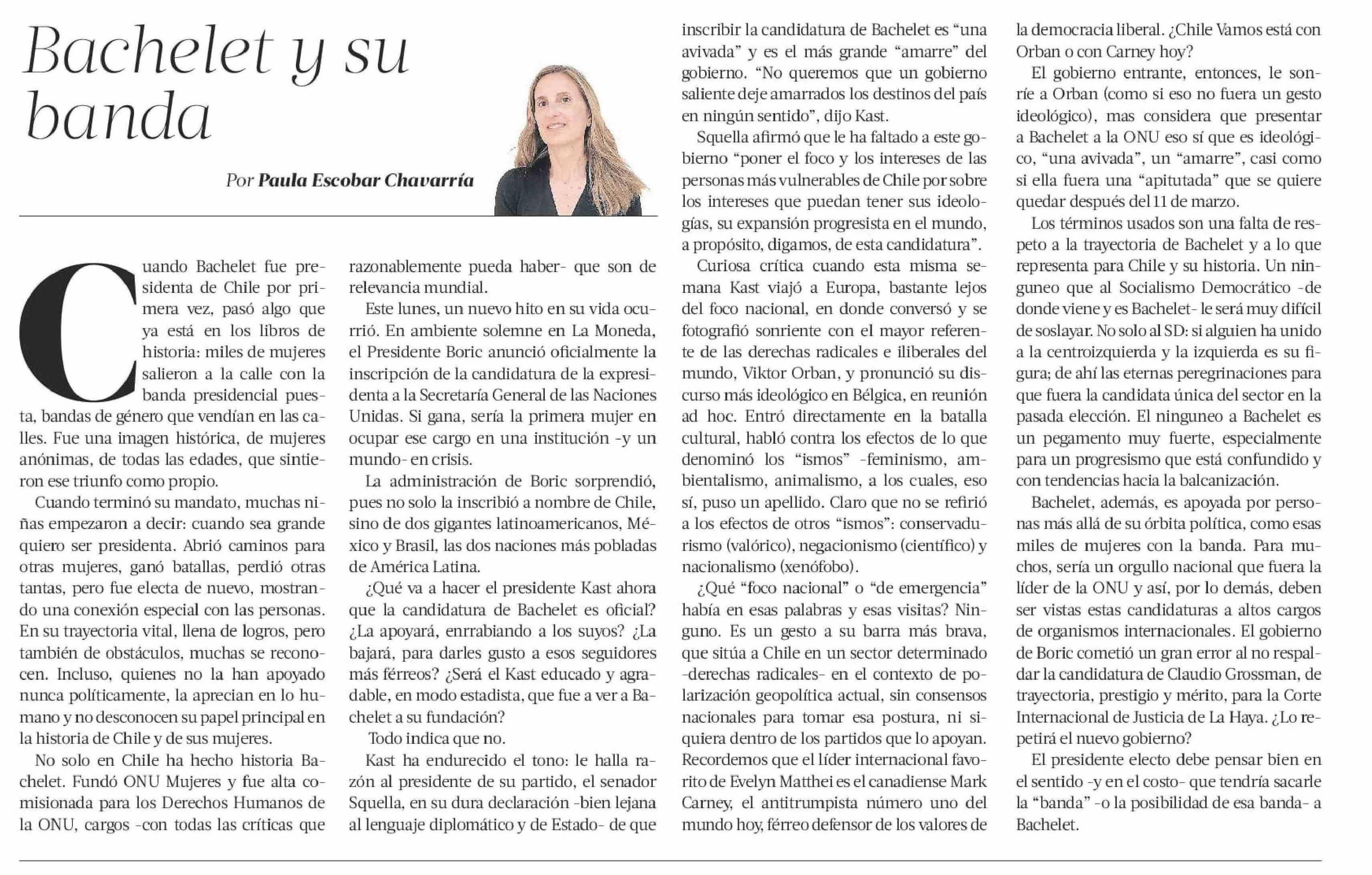 COLUMNAS DE OPINIÓN: Bachelet y su banda 08-02-2026 La Tercera |