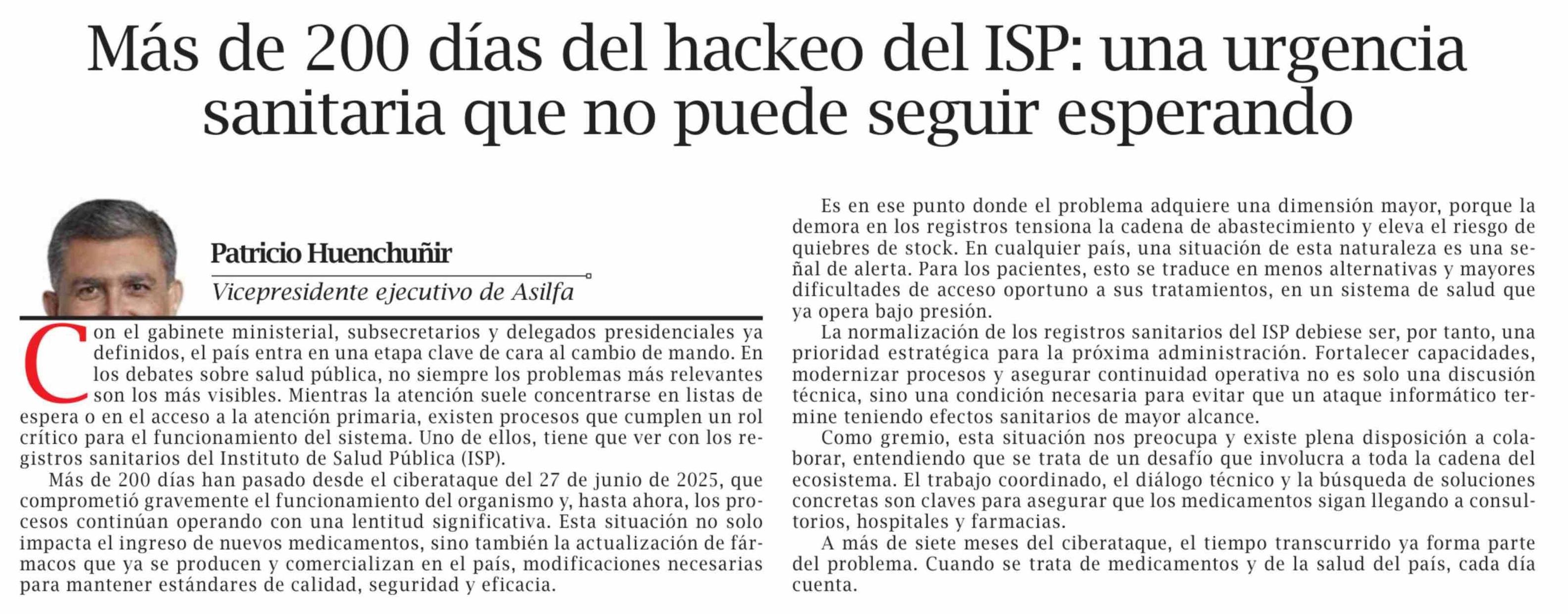 Título: Columnas de Opinión: Más de 200 días del hackeo del ISP: una urgencia sanitaria que no puede seguir esperando