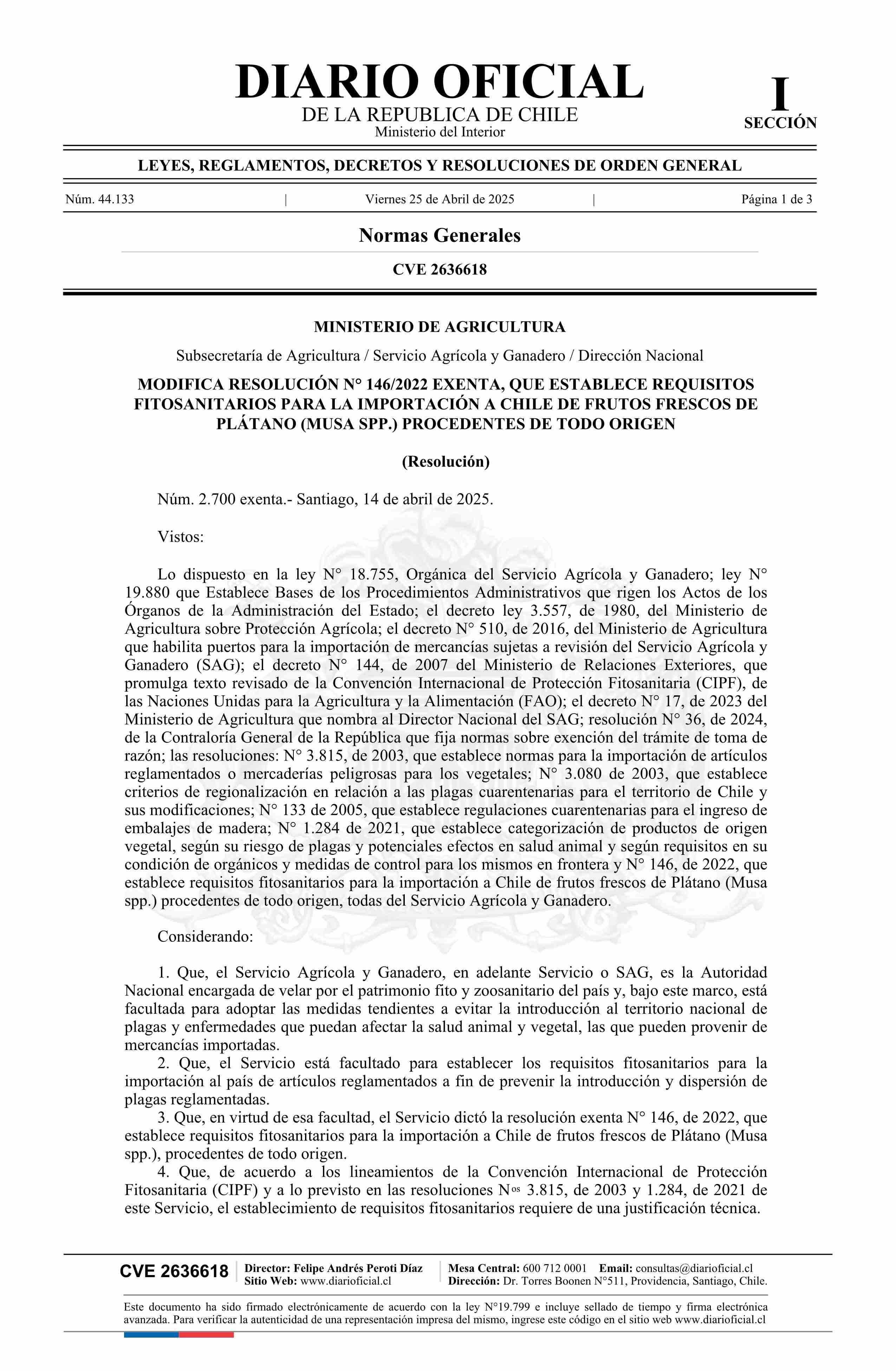Título: Resolución exenta número 2.700, de 2025.- Modifica resolución N° 146 exenta, de 2022, que establece requisitos fitosanitarios para la importación a Chile de frutos frescos de Plátano (Musa spp.) procedentes de todo origen