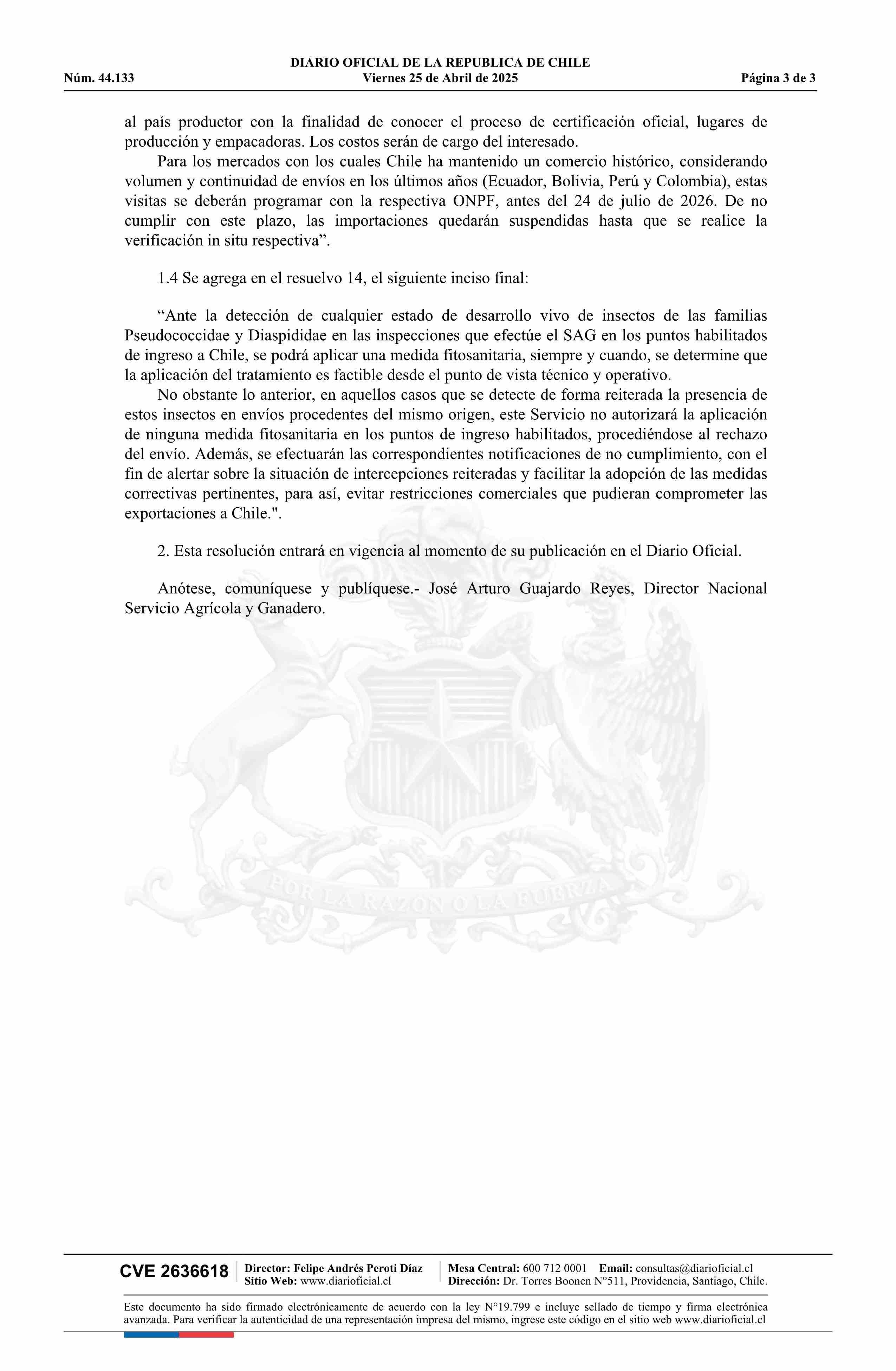 Resolución exenta número 2.700, de 2025.- Modifica resolución N° 146 exenta, de 2022, que establece requisitos fitosanitarios para la importación a Chile de frutos frescos de Plátano (Musa spp.) procedentes de todo origen