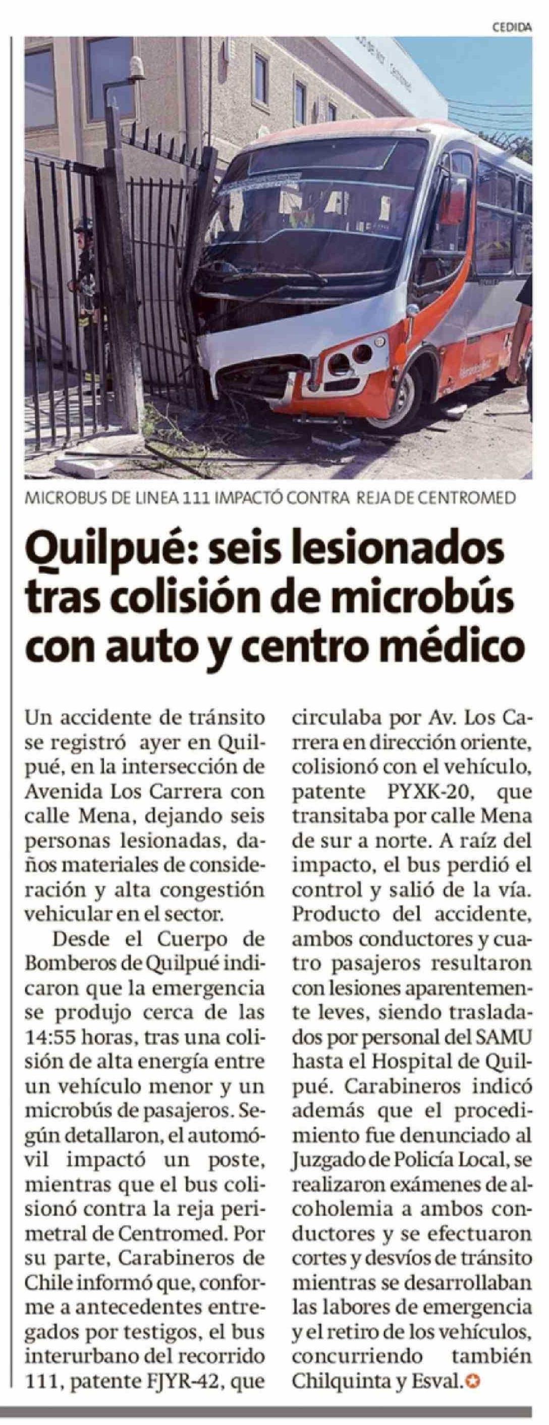 Título: Quilpué: seis lesionados tras colisión de microbús con auto y centro médico