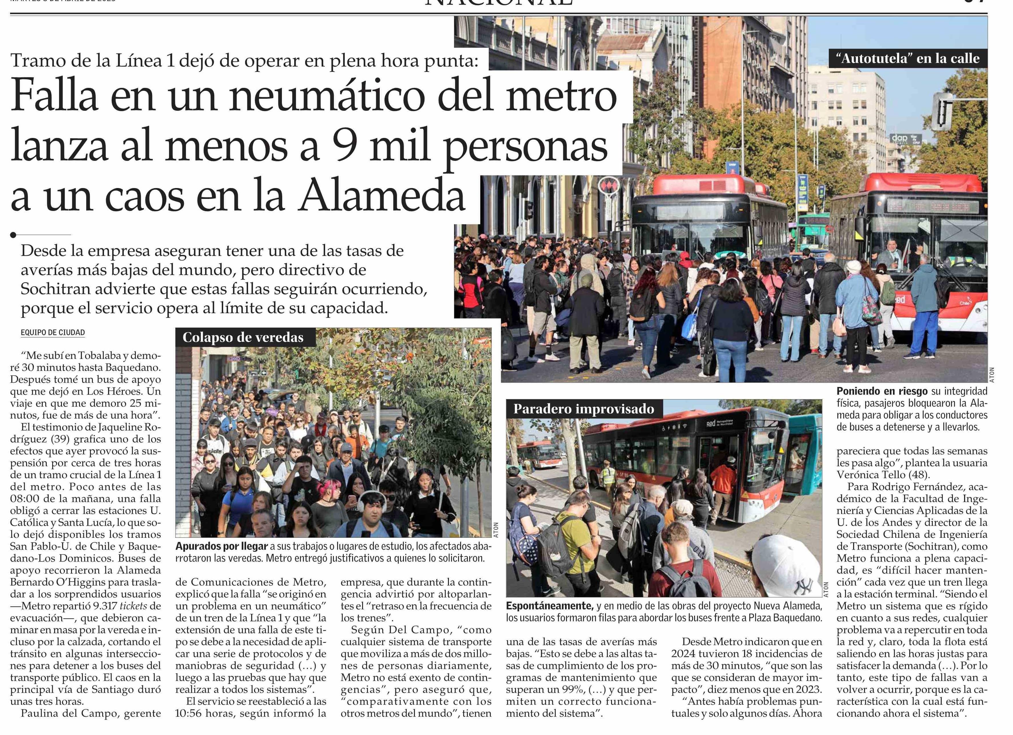 Falla en un neumático del metro lanza al menos a 9 mil personas a un caos en la Alameda 08-04-2025 El Mercurio |