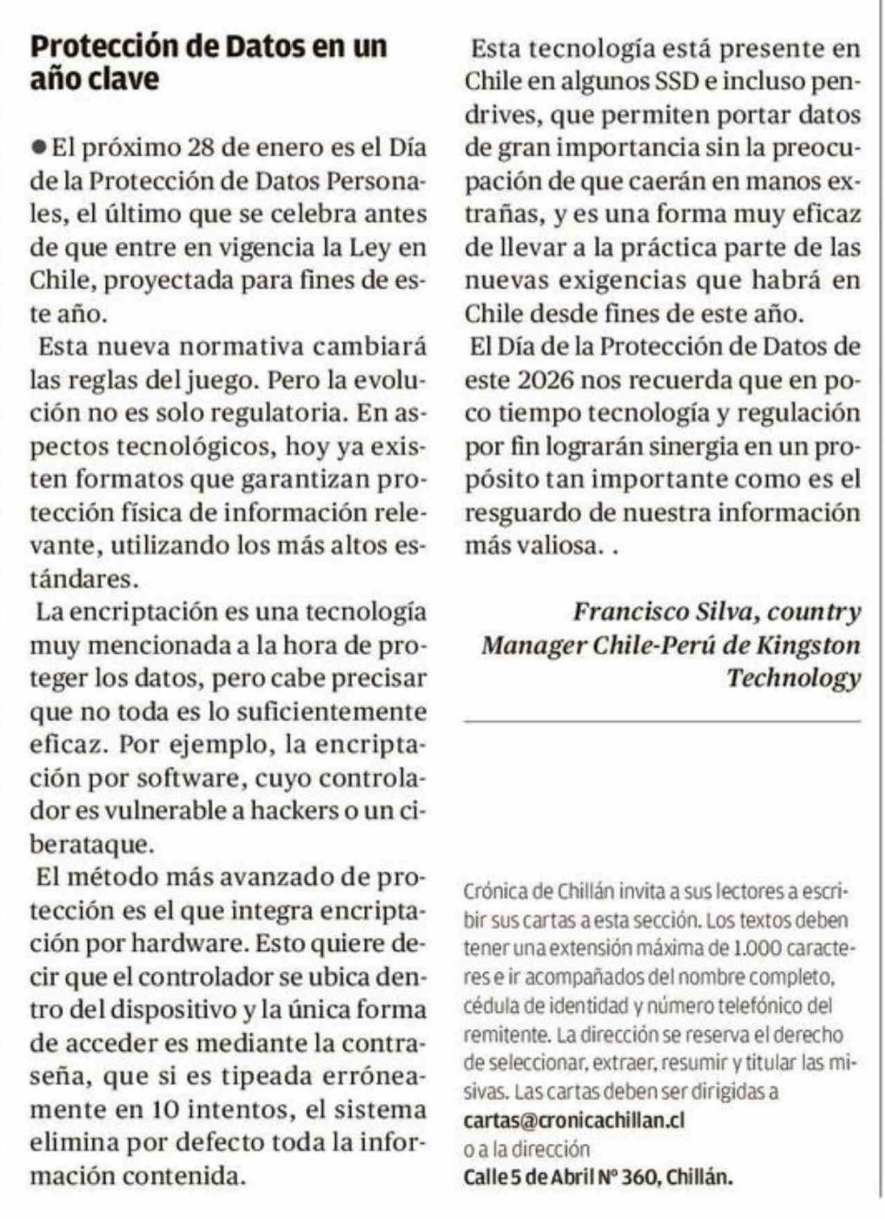Cartas: Protección de Datos en un año clave 21-01-2026 Crónica de Chillán |