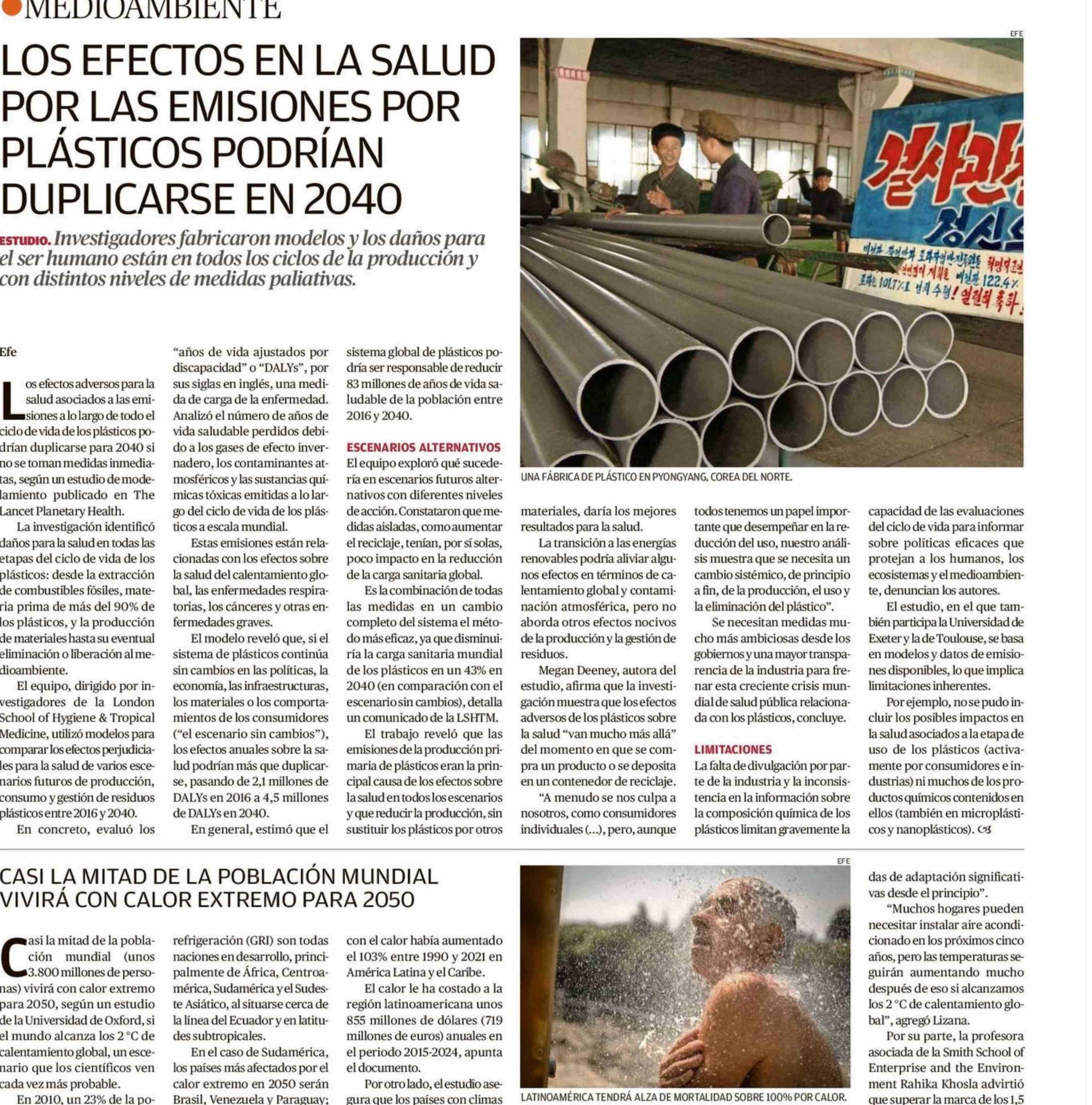 | Título: | LOS EFECTOS EN LA SALUD POR LAS EMISIONES POR PLÁSTICOS PODRÍAN DUPLICARSE EN 2040 |