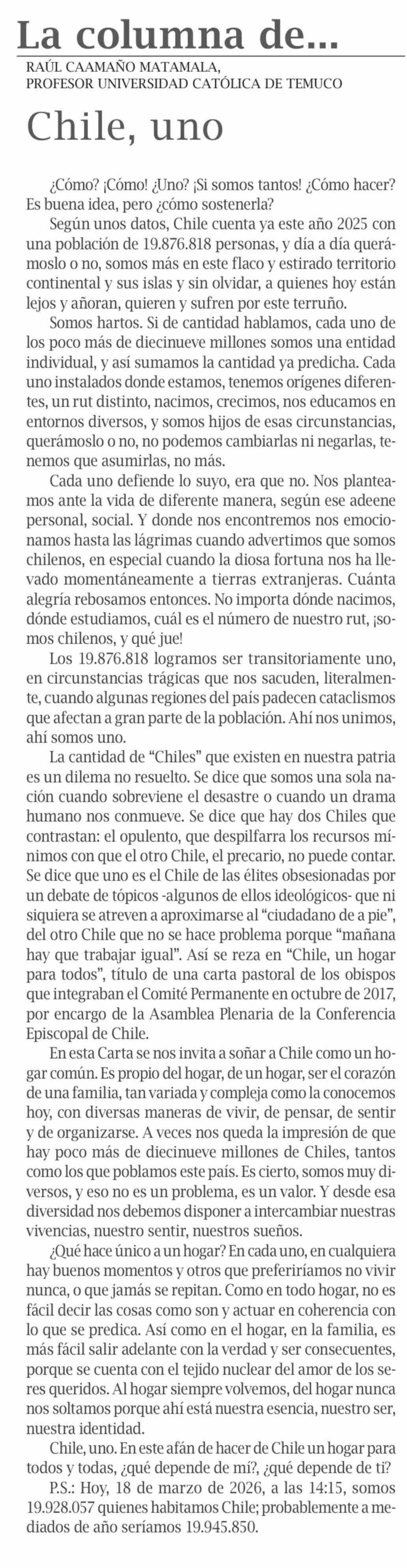 Columnas de Opinión: Chile, uno 19-03-2026 El Pingüino |