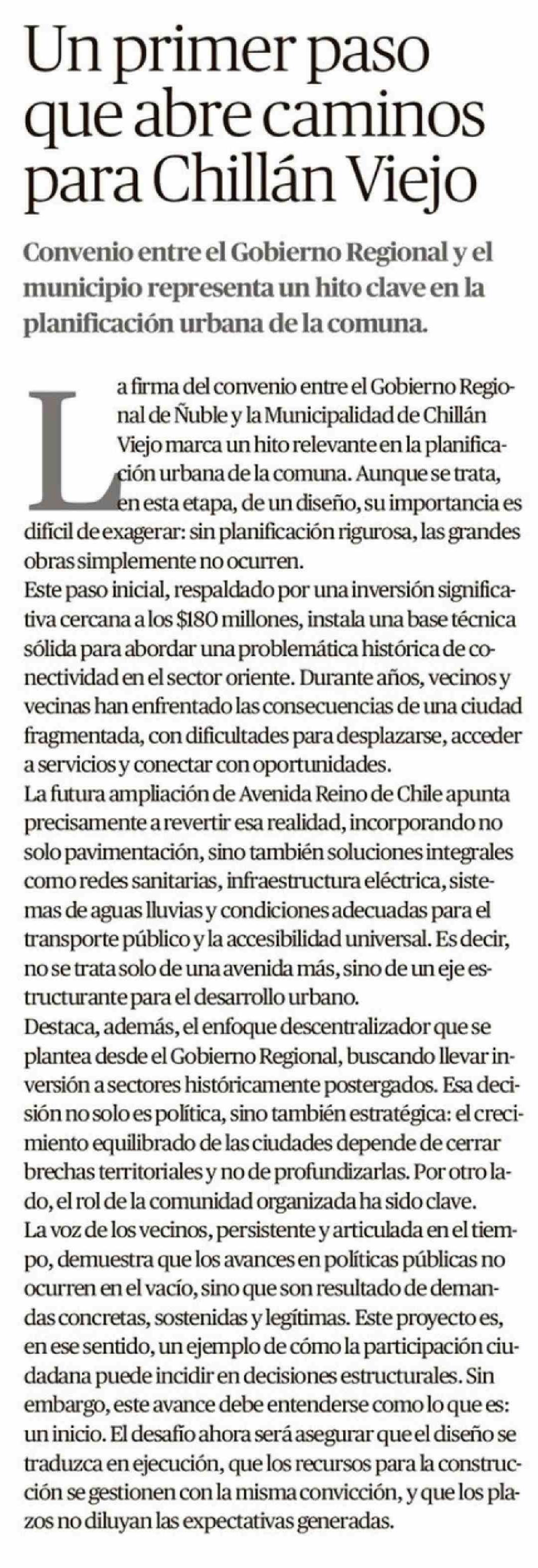 Título: Editorial: Un primer paso que abre caminos para Chillán Viejo