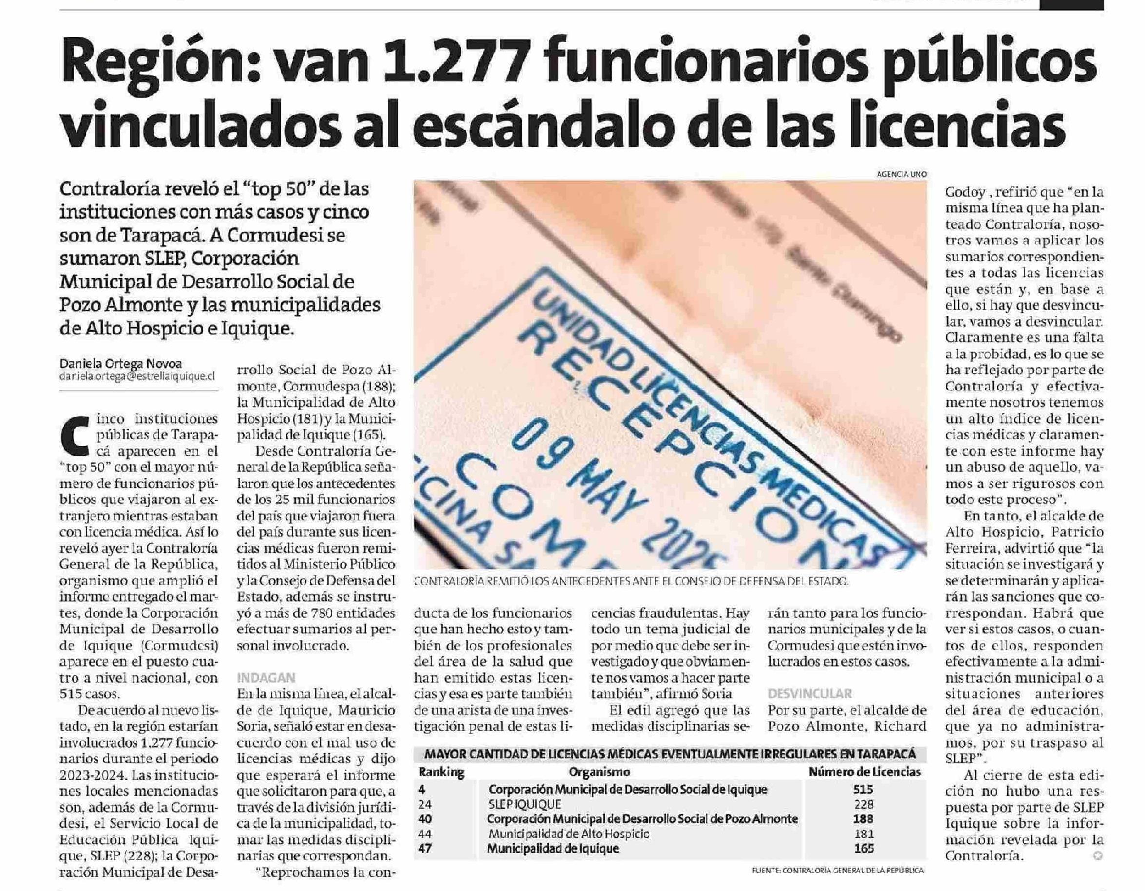 Región: van 1.277 funcionarios públicos vinculados al escándalo de las licencias 23-05-2025 La Estrella de Iquique |