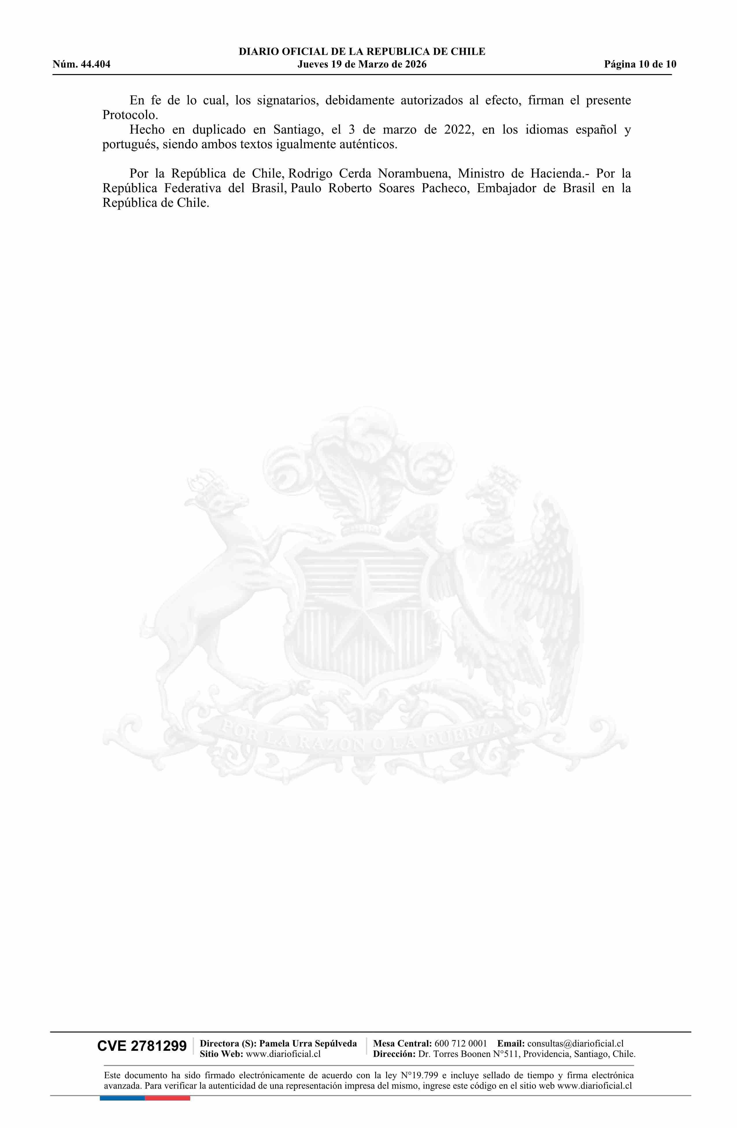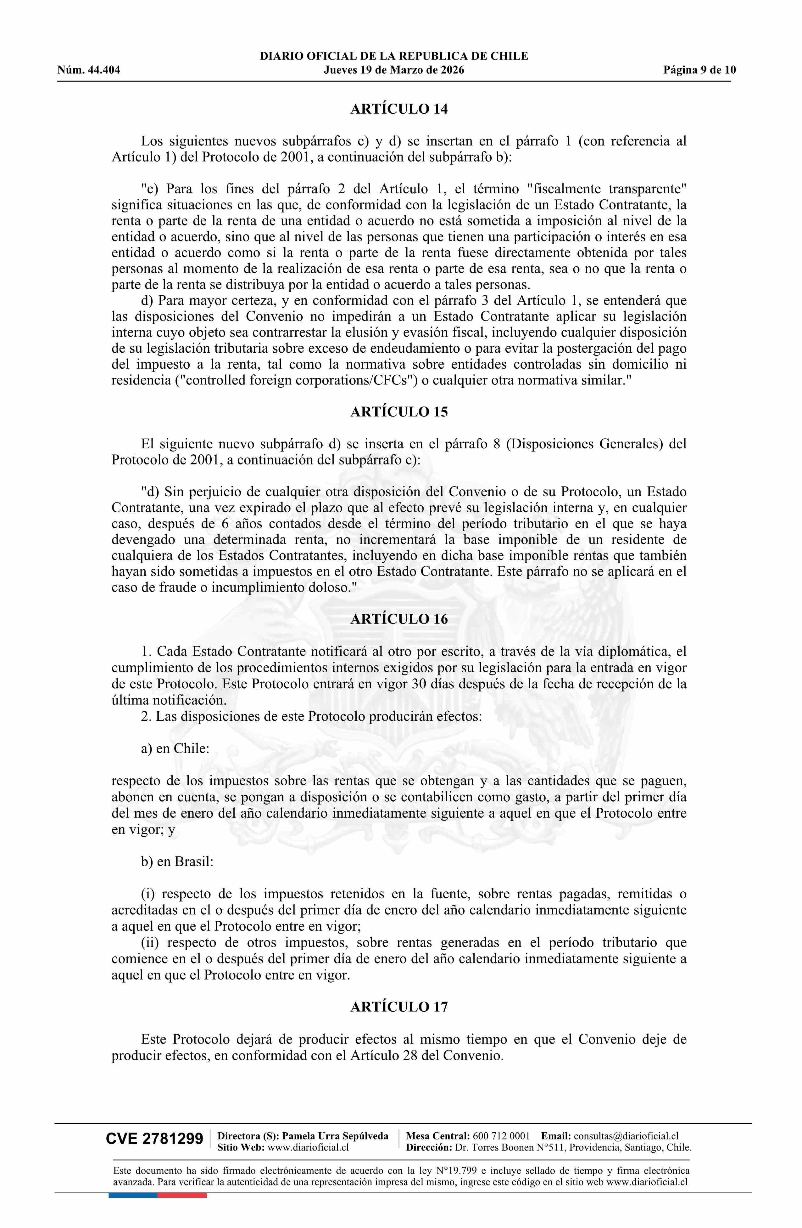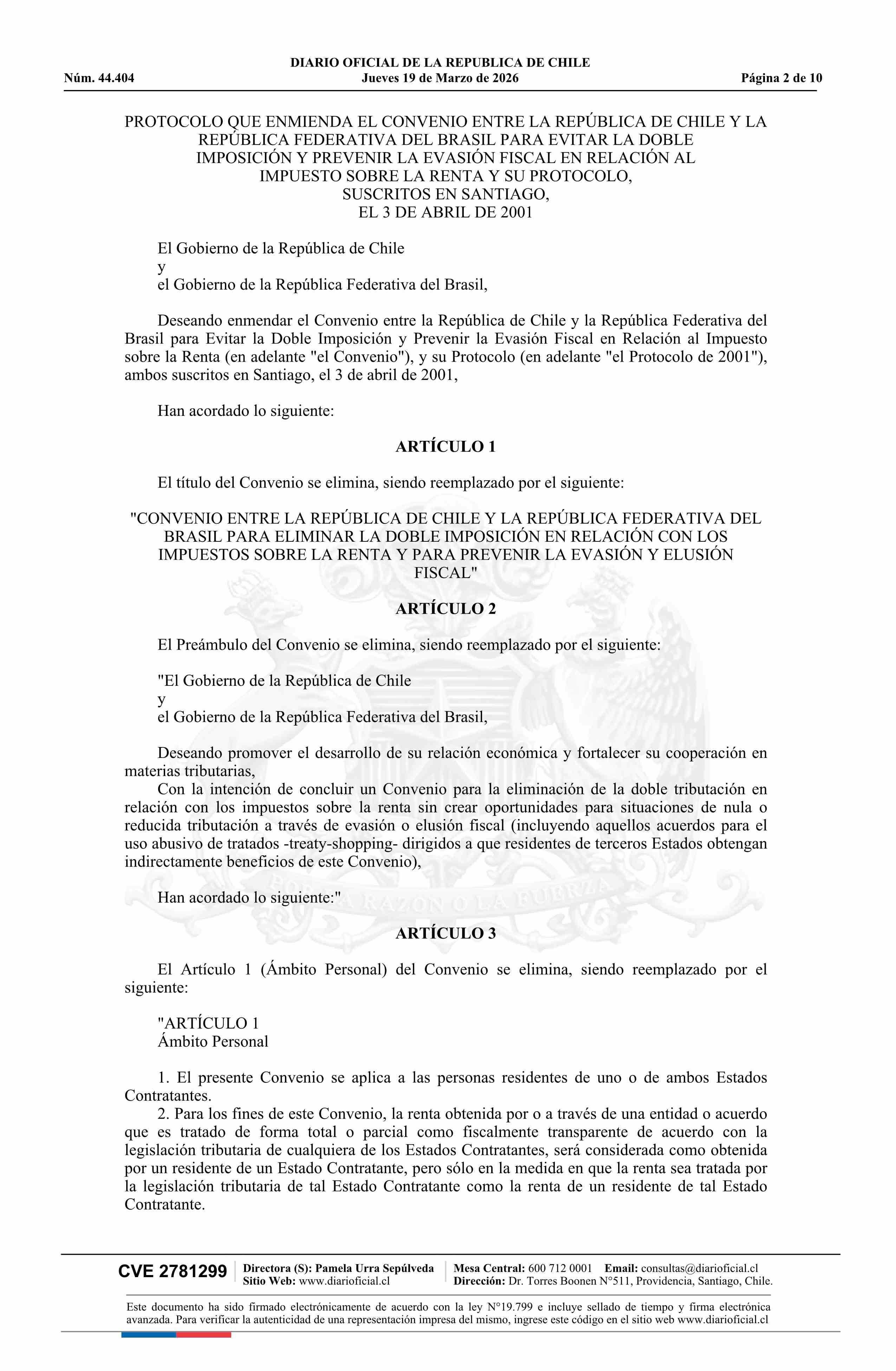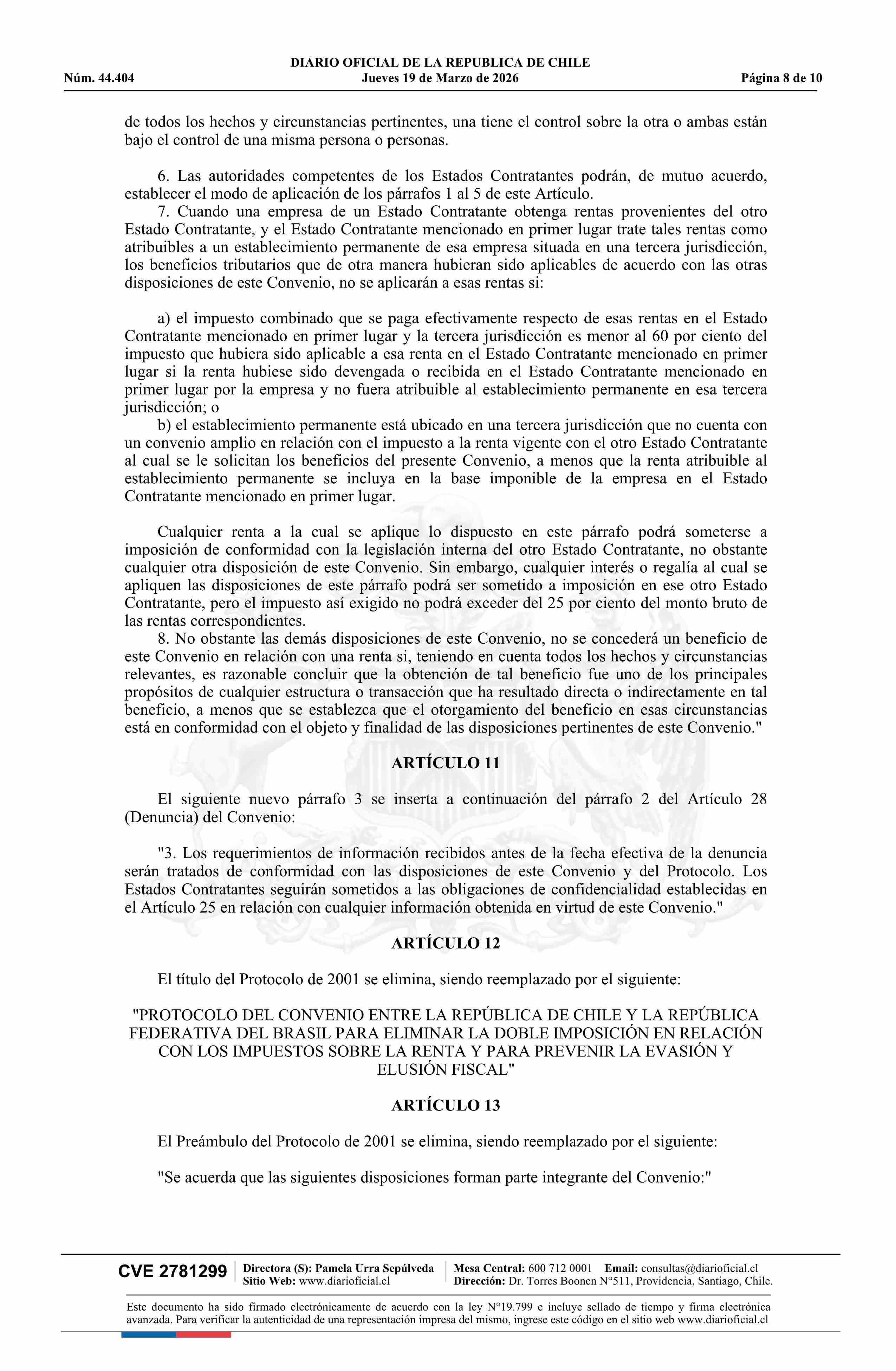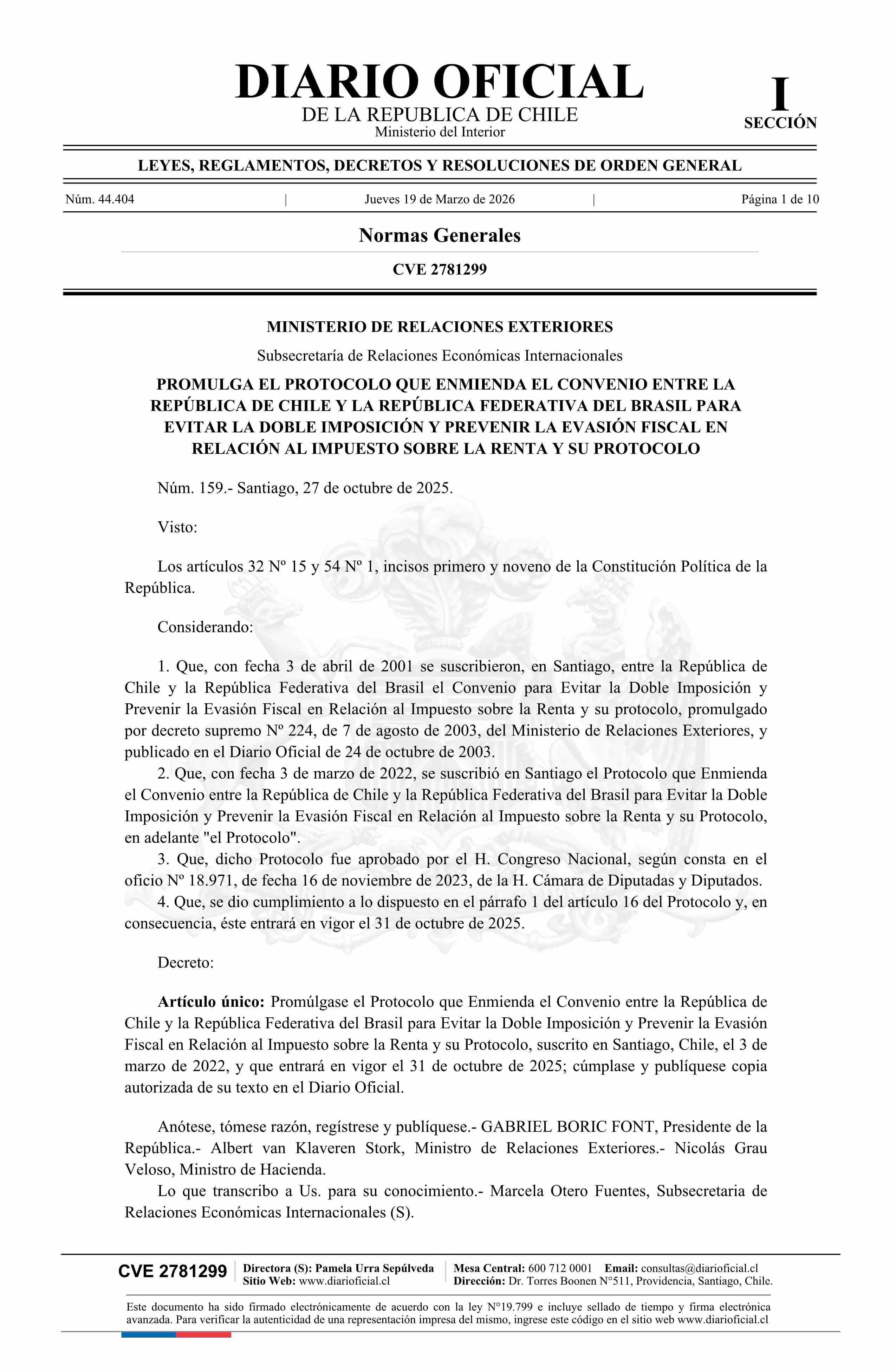 | Título: | Decreto número 159, de 2025.- Promulga el Protocolo que Enmienda el Convenio entre la República de Chile y la República Federativa del Brasil para Evitar la Doble Imposición y Prevenir la Evasión Fiscal en relación al Impuesto sobre la Renta y su Protocolo |
