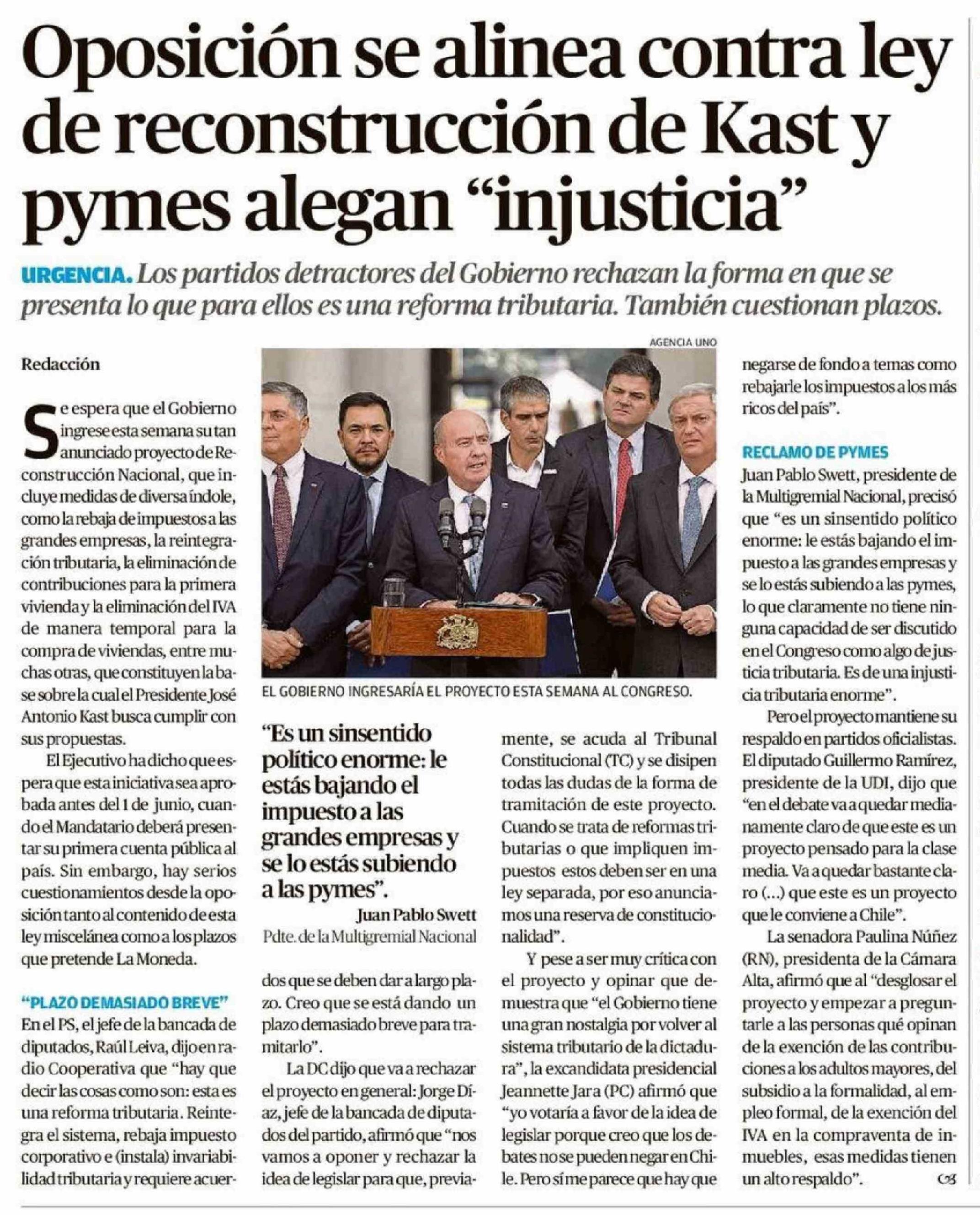 Título: Oposición se alinea contra ley de reconstrucción de Kast y pymes alegan "injusticia"