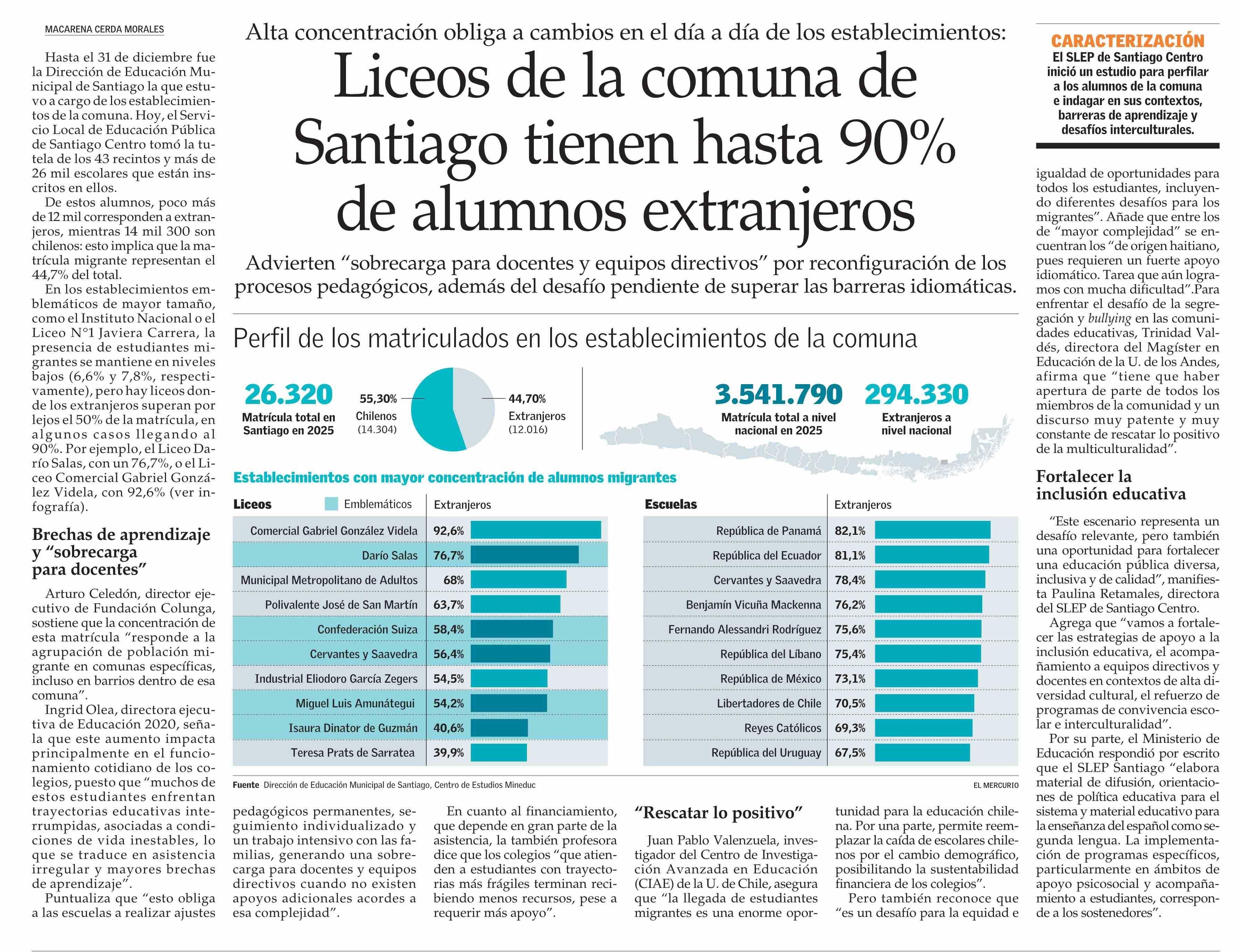 Liceos de la comuna de Santiago tienen hasta 90% de alumnos extranjeros 07-02-2026 El Mercurio |