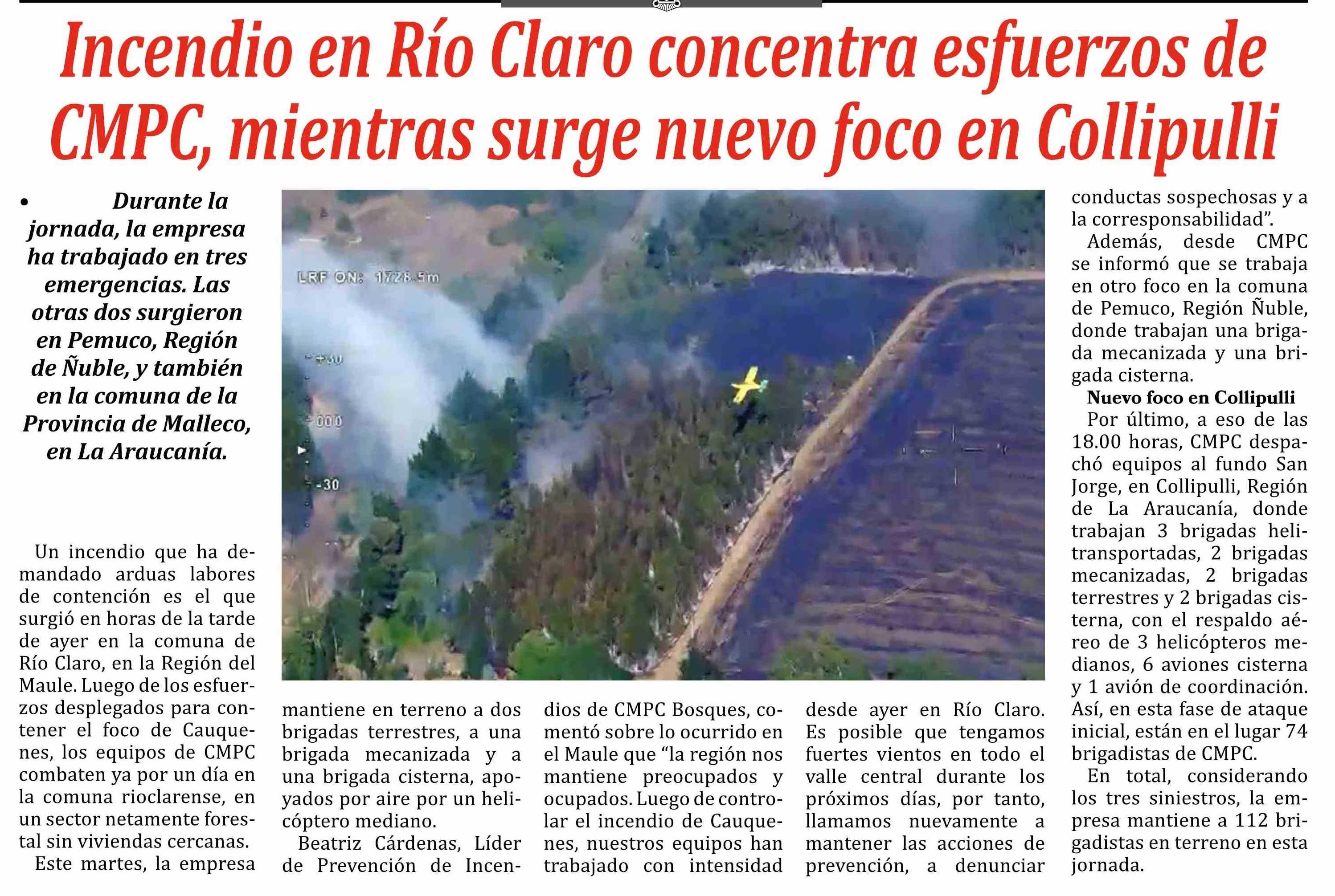 | Título: | Incendio en Río Claro concentra esfuerzos de CMPC, mientras surge nuevo foco en Collipulli |
