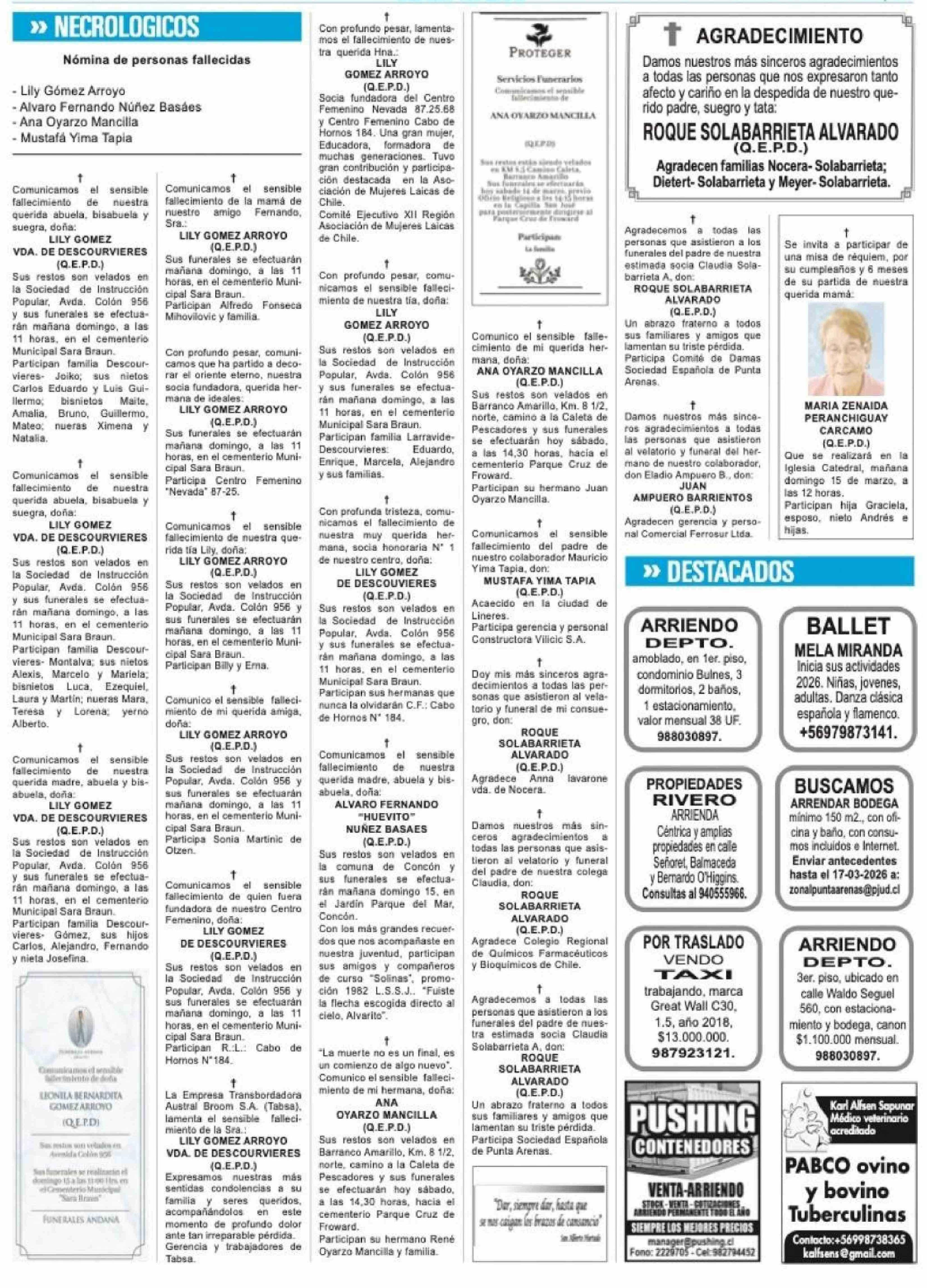 NECROLOGICOS 14-03-2026 La Prensa Austral |