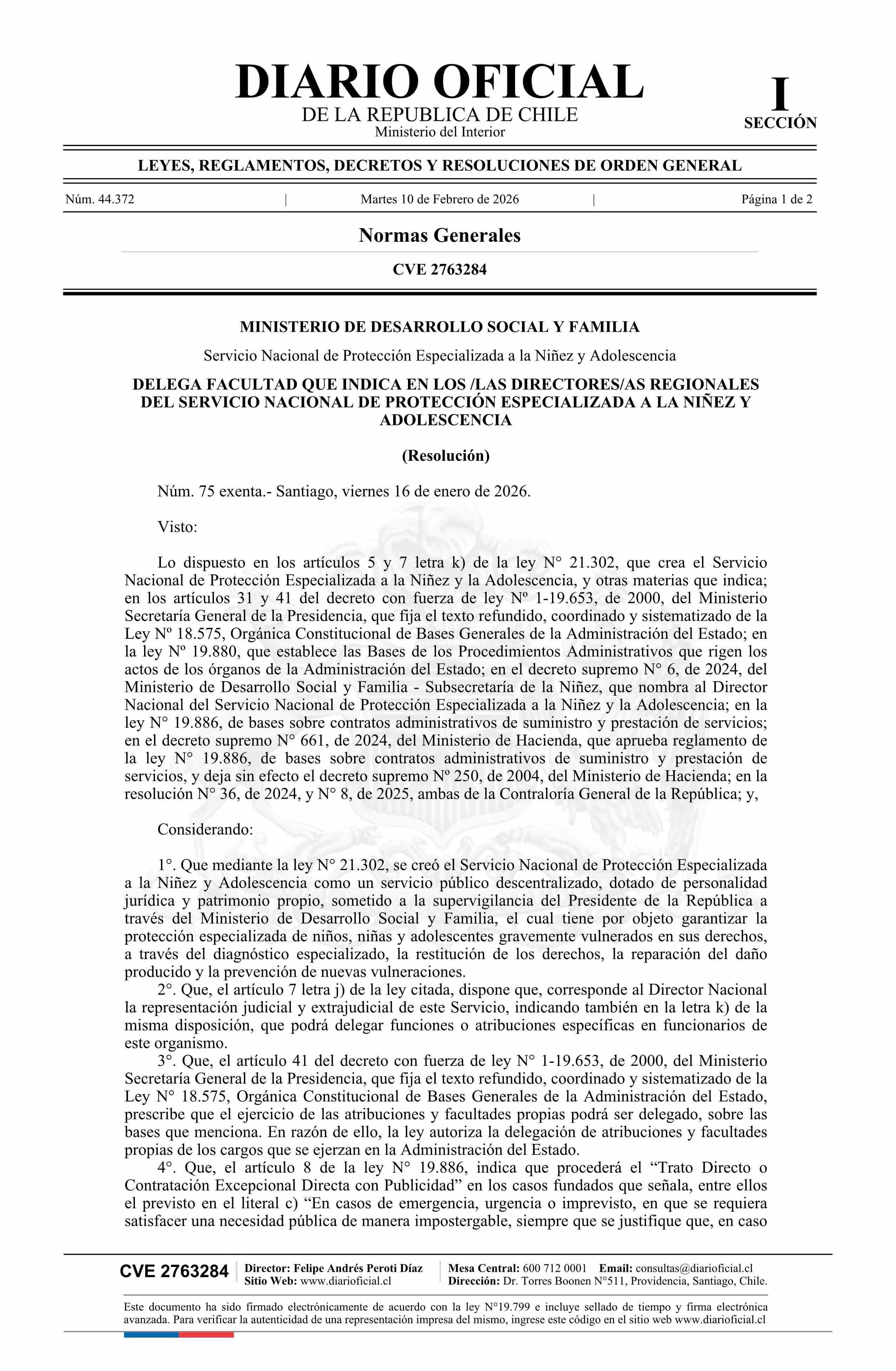 Título: Resolución exenta número 75, de 2026.- Delega facultad que indica en los/as directores/as regionales del Servicio Nacional de Protección Especializada a la Niñez y Adolescencia