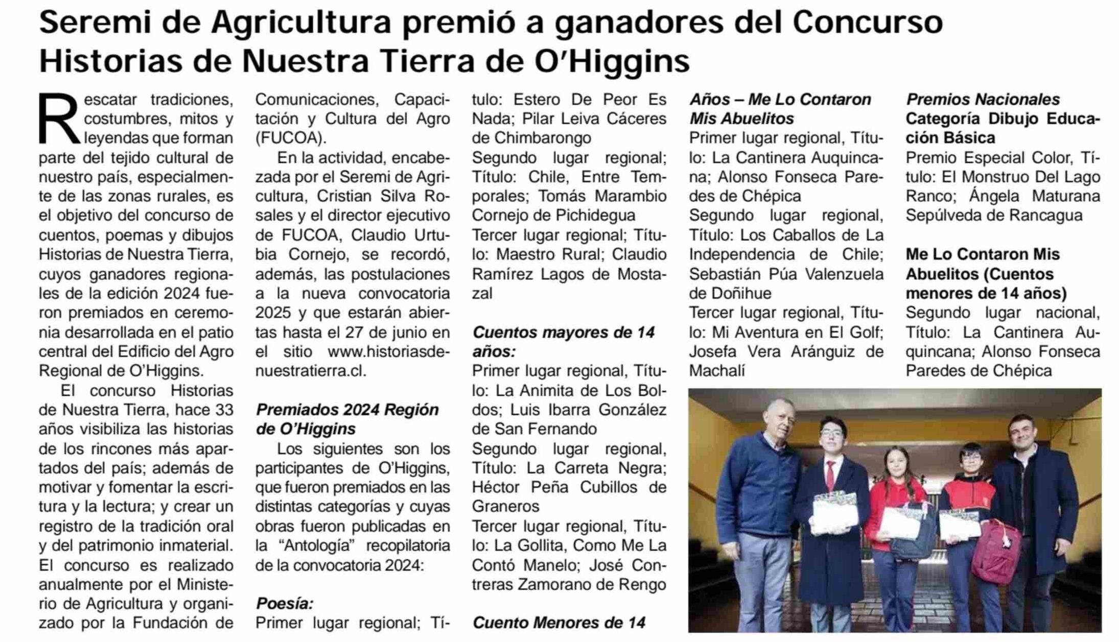 Título: Seremi de Agricultura premió a ganadores del Concurso Historias de Nuestra Tierra de O’Higgins