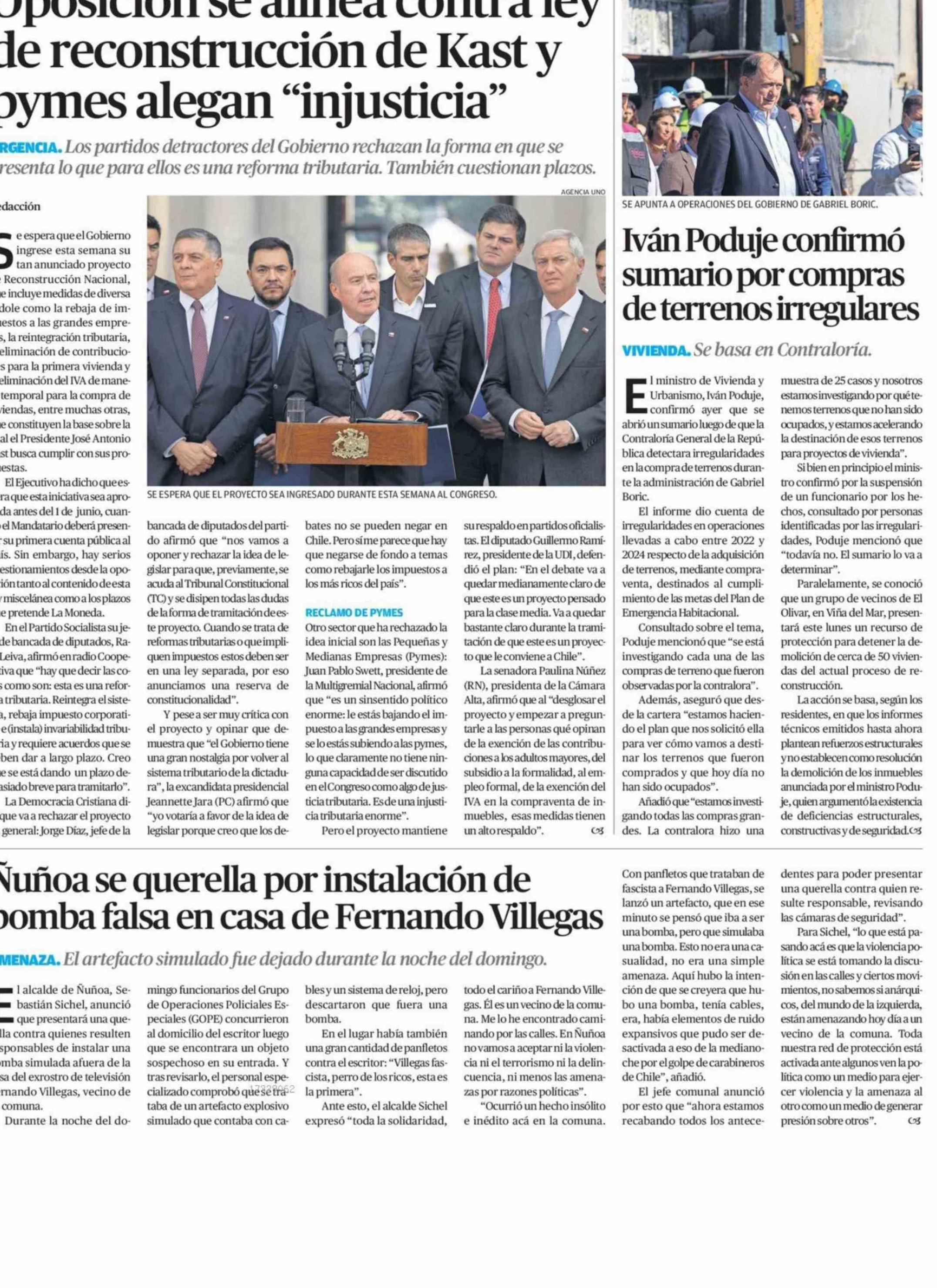 Oposición se alinea contra ley de reconstrucción de Kast y pymes alegan "injusticia" 21-04-2026 El Mercurio de Antofagasta |