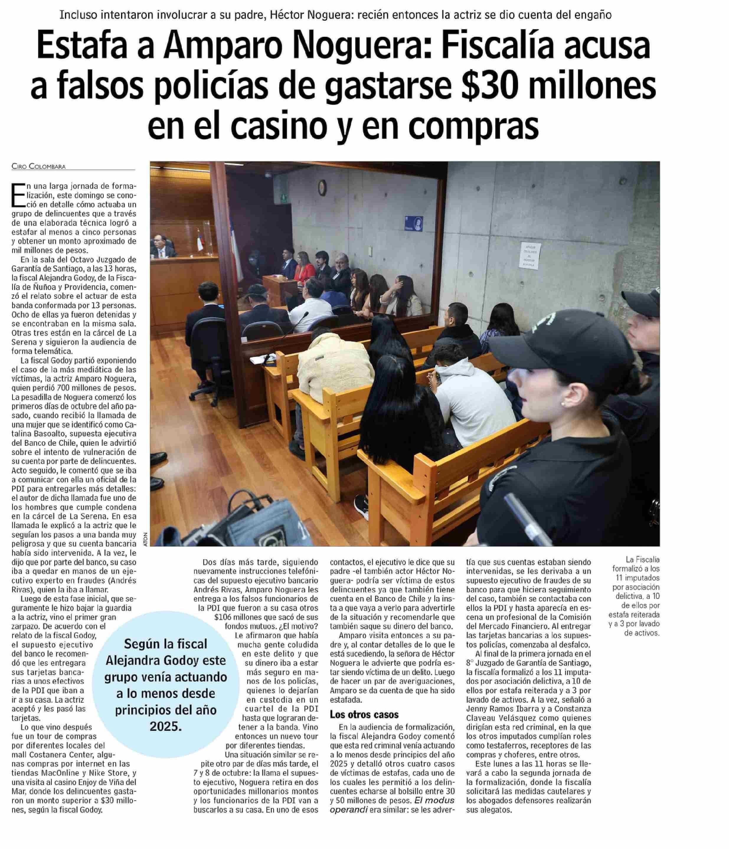 Estafa a Amparo Noguera: Fiscalía acusa a falsos policías de gastarse $30 millones en el casino y en compras 12-01-2026 Las Últimas Noticias |