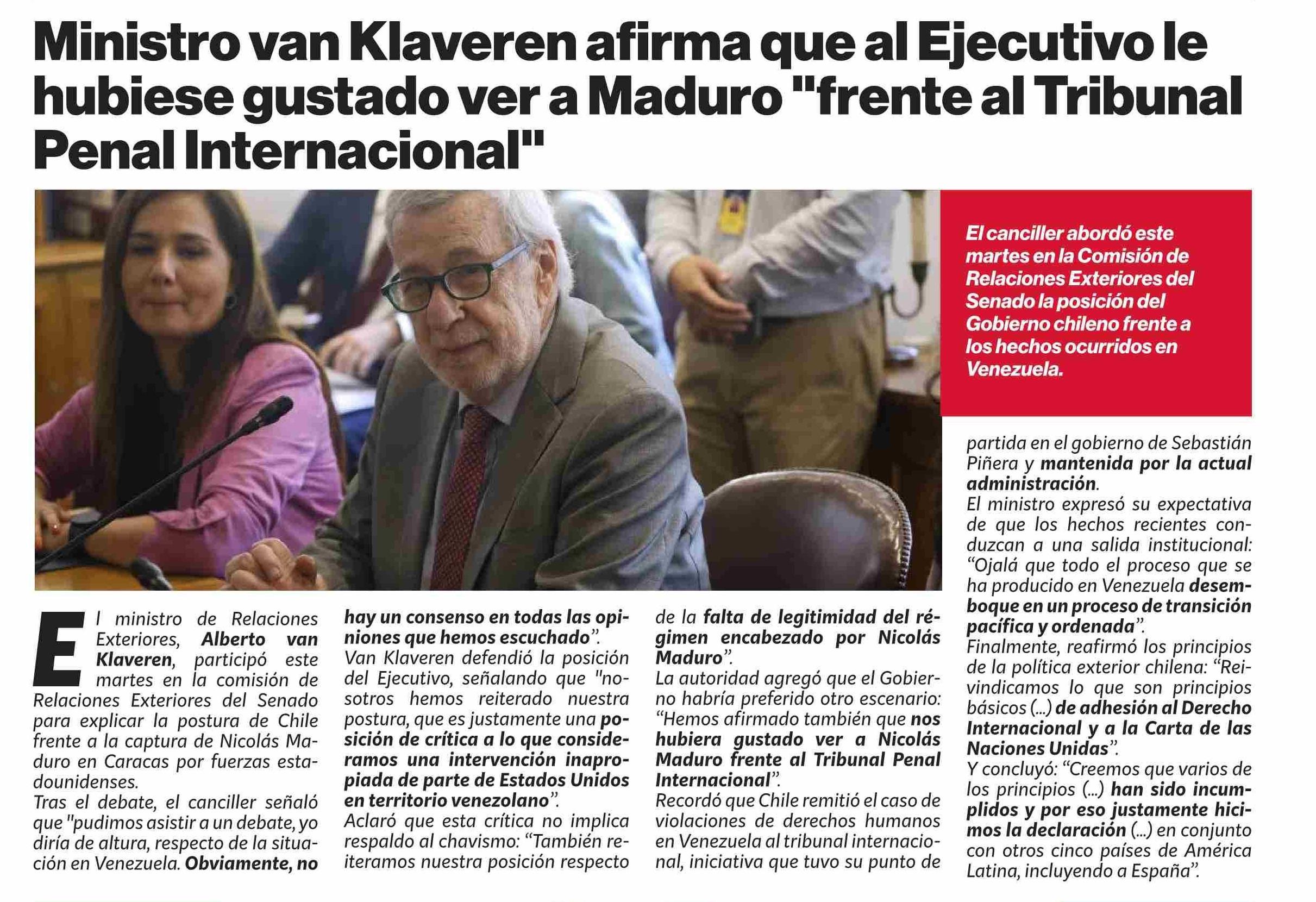 Título: Ministro van Klaveren afirma que al Ejecutivo le hubiese gustado ver a Maduro “frente al Tribunal Penal Internacional”