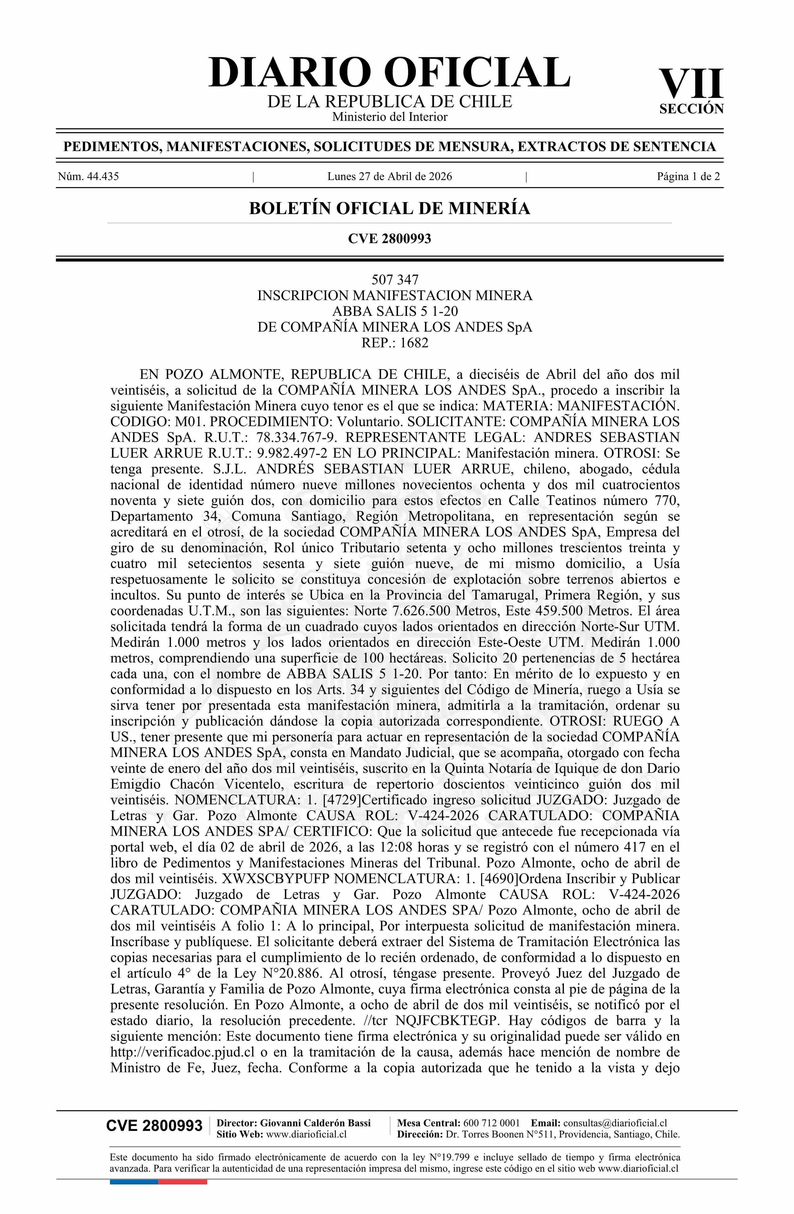 ABBA SALIS 5 1-20 / Compañía Minera Los Andes SpA 27-04-2026 DIARIO OFICIAL CHILE - BOLETÍN OFICIAL DE MINERÍA |
