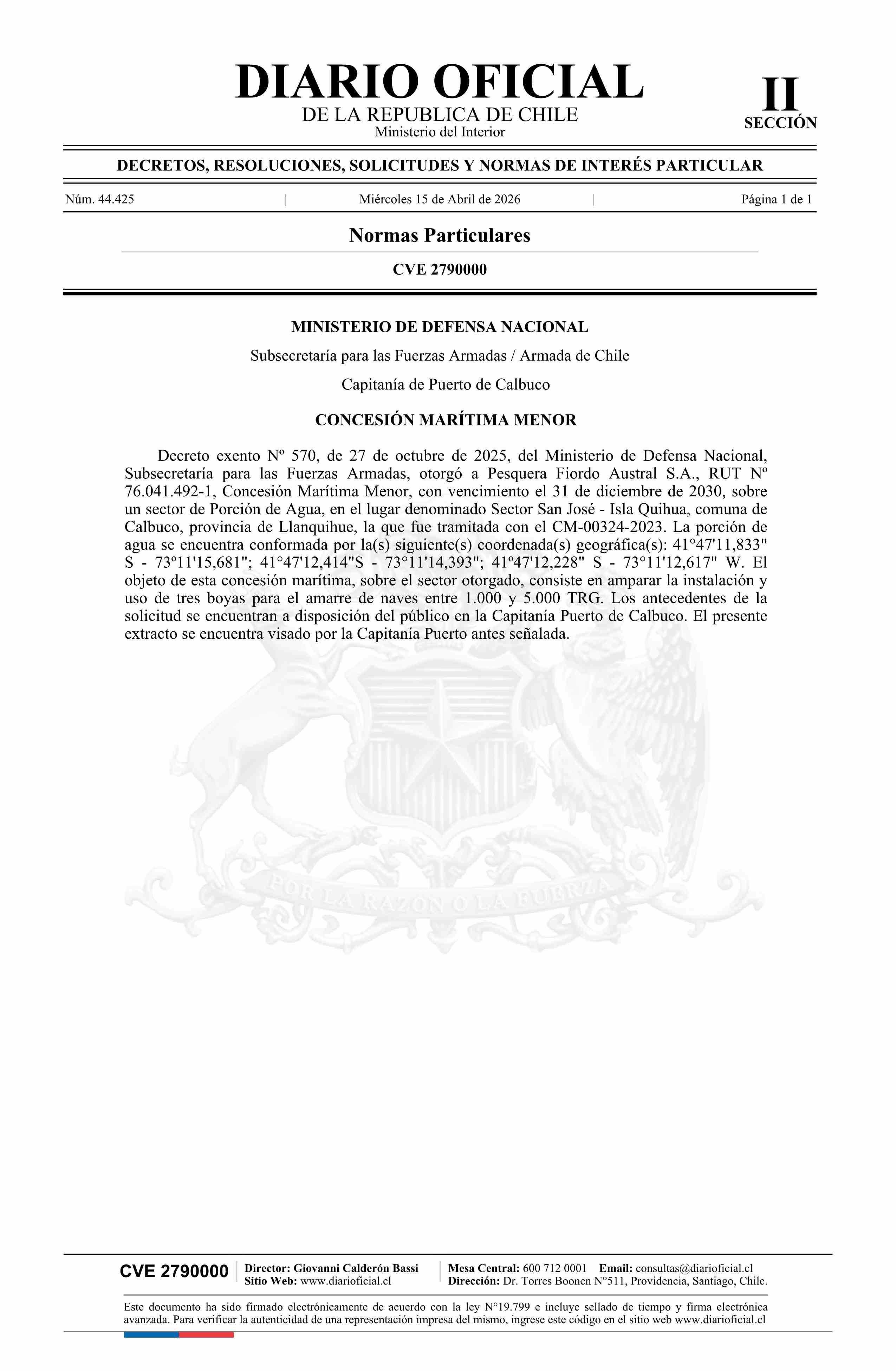 Extracto de decreto exento número 570, de 2025.- Otorgamiento concesión marítima menor 15-04-2026 Diario Oficial Edición Electrónica |