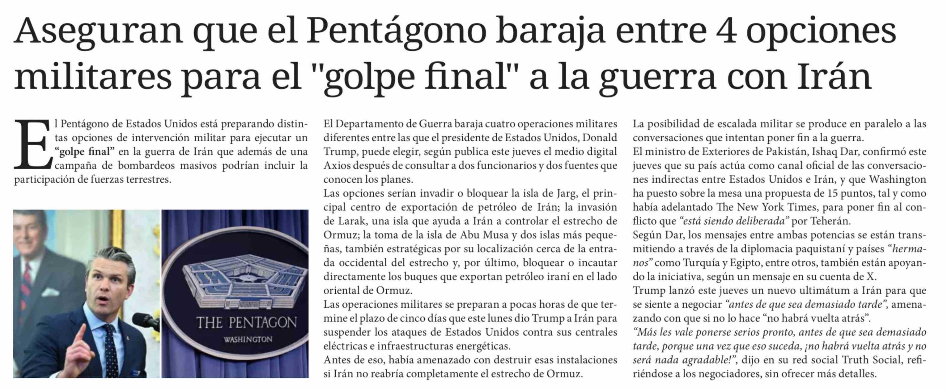 Aseguran que el Pentágono baraja entre 4 opciones militares para el "golpe final" a la guerra con Irán 27-03-2026 Diario Chañarcillo |