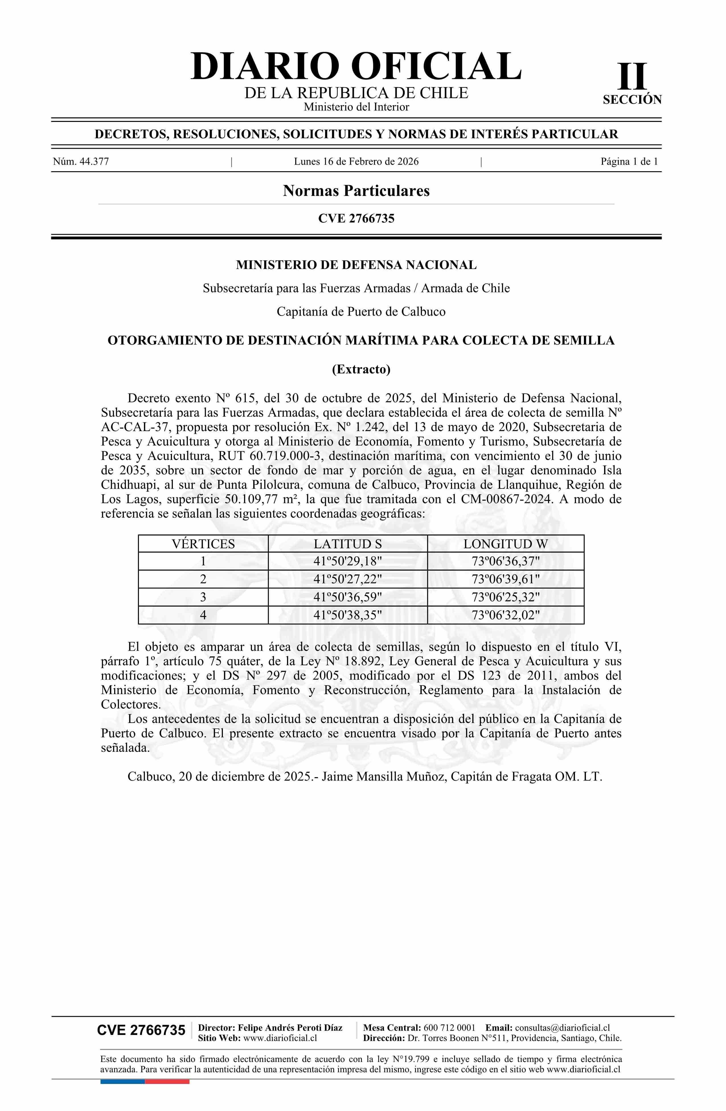 Extracto de decreto exento número 615, de 2025.- Otorgamiento de destinación marítima para colecta de semilla 16-02-2026 Diario Oficial Edición Electrónica |