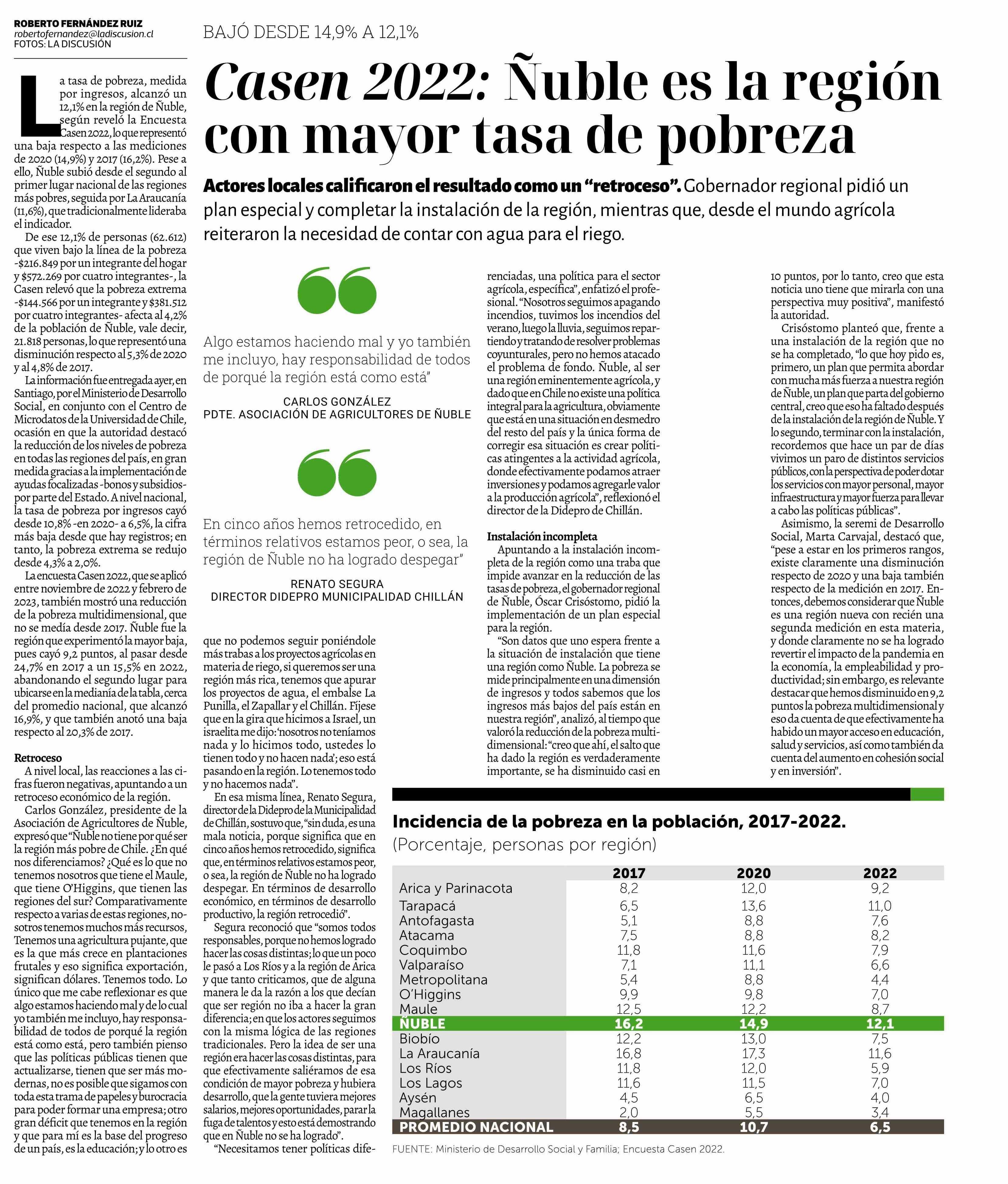 Casen 2022: Ñuble es la región con mayor tasa de pobreza 28-07-2023 La Discusión |