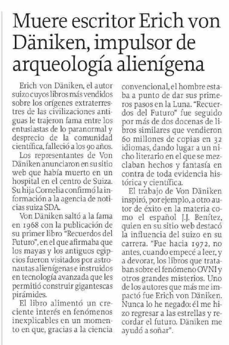 | Título: | Muere escritor Erich von Däniken, impulsor de arqueología alienígena |