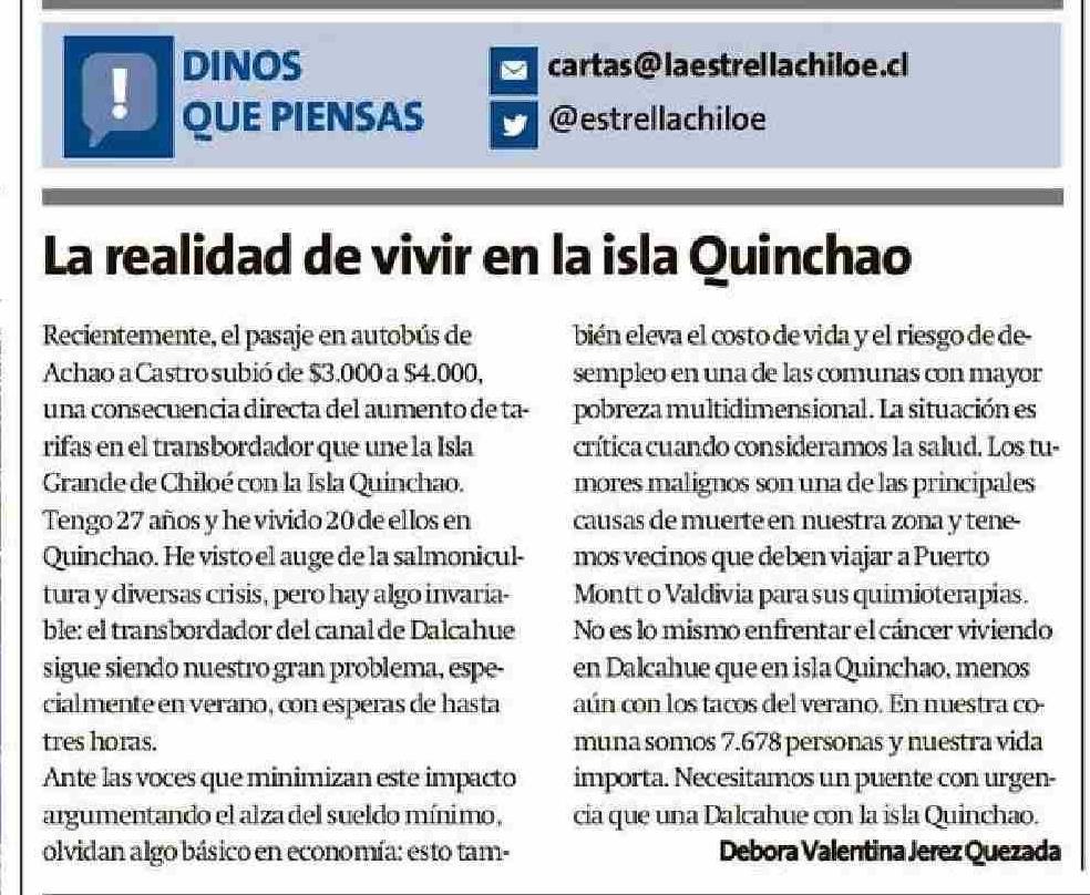 Cartas: La realidad de vivir en la isla Quinchao 21-01-2026 La Estrella de Chiloé |