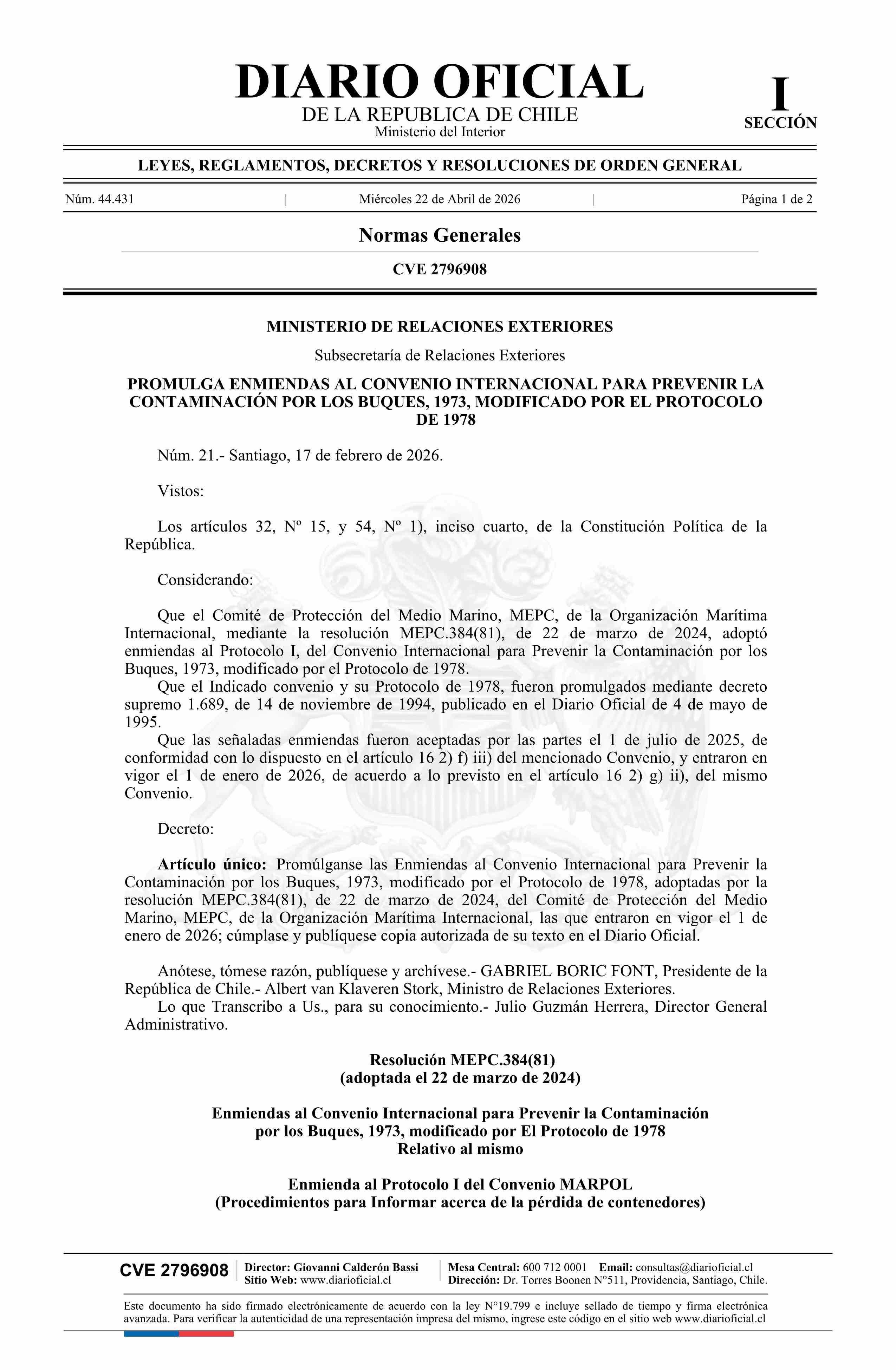 Título: Decreto número 21, de 2026.- Promulga enmiendas al Convenio Internacional para Prevenir la Contaminación por los Buques, 1973, modificado por el Protocolo de 1978