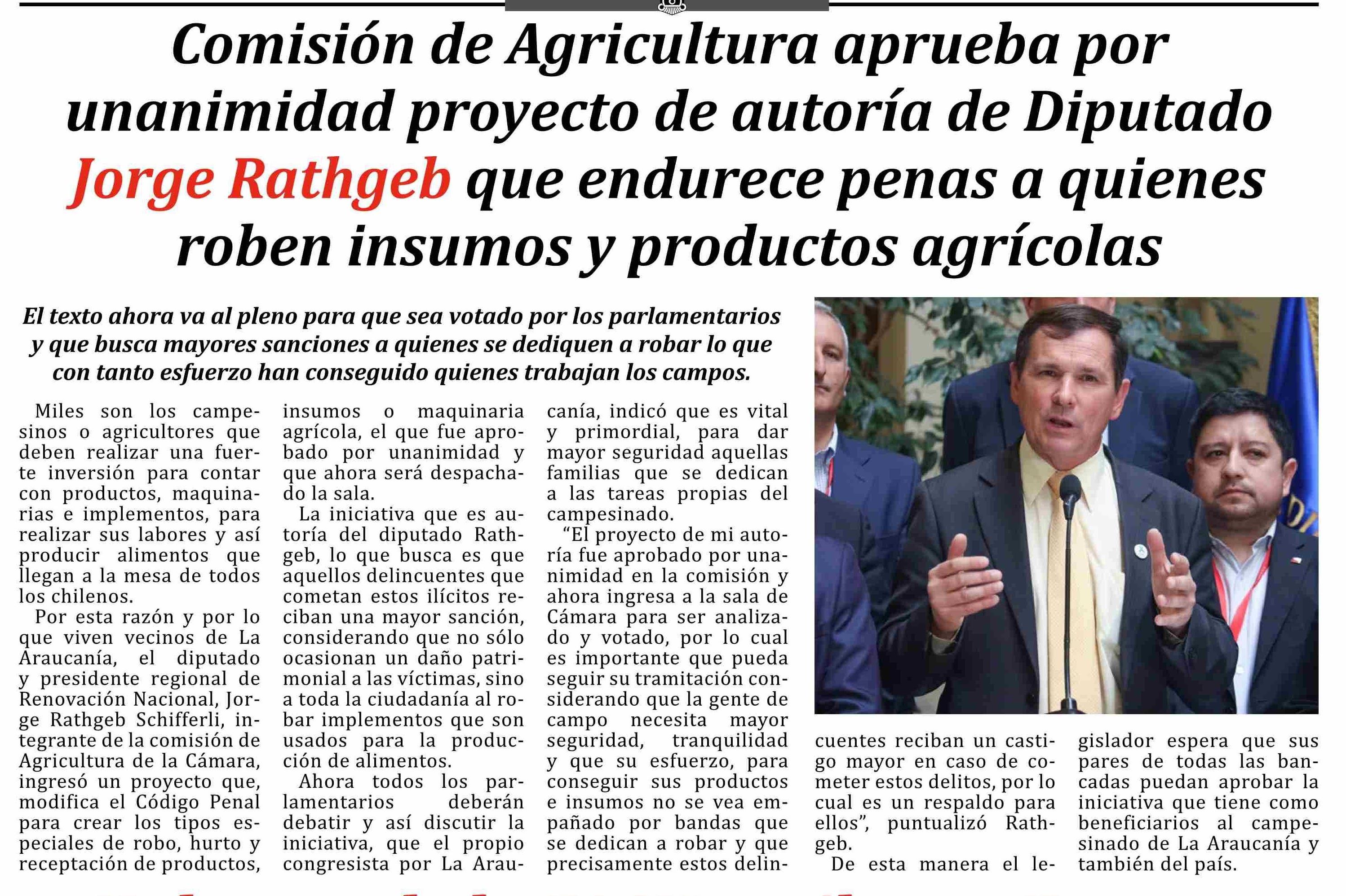 Título: Comisión de Agricultura aprueba por unanimidad proyecto de autoría de Diputado Jorge Rathgeb que endurece penas a quienes roben insumos y productos agrícolas