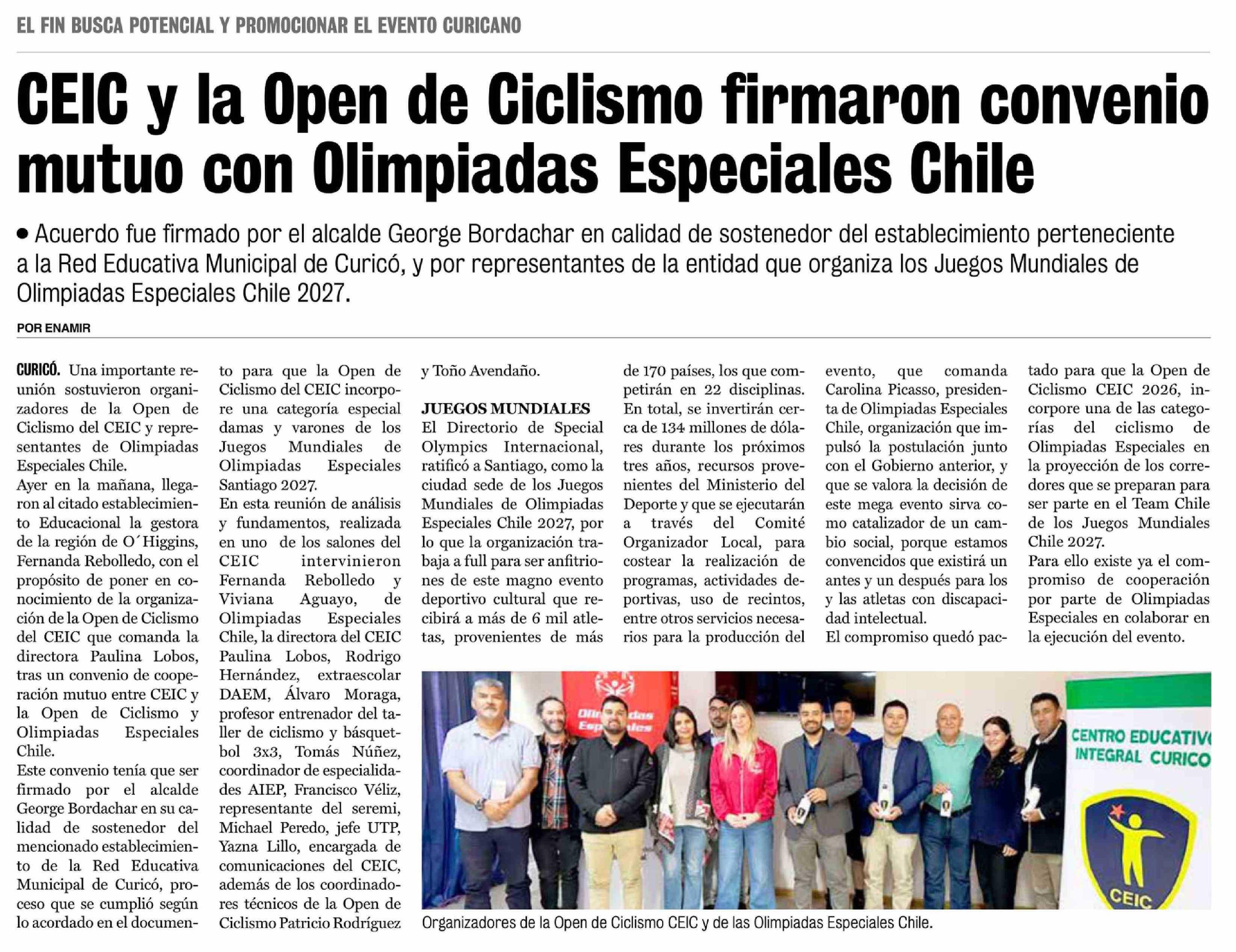 Título: CEIC y la Open de Ciclismo firmaron convenio mutuo con Olimpiadas Especiales Chile